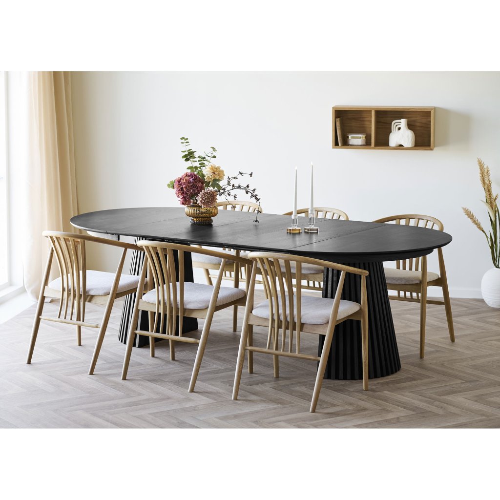 Krásný jídelní stůl OSAKA od dánské značky nádherného skandinávského nábytku HOUSE NORDIC. Jídelní stůl spojuje přírodní vzhled s praktickým řešením pro každodenní i slavnostní stolování. Je vyroben z MDF desky s dubovou dýhou v elegantním černém provedení. Díky promyšlené konstrukci a třem rozšiřovacím deskám lze stůl snadno přizpůsobit vašim potřebám. Z původního průměru 120 cm, lze zvětšit až na délku 240 cm. Výška 75 cm zajišťuje pohodlné sezení a dostatek prostoru pro nohy. Materiály nesou FSC certifikaci, což zaručuje šetrný přístup k přírodě.