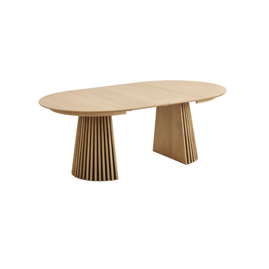 Krásný jídelní stůl OSAKA od dánské značky nádherného skandinávského nábytku HOUSE NORDIC. Jídelní stůl spojuje přírodní vzhled s praktickým řešením pro každodenní i slavnostní stolování. Je vyroben z MDF desky s dubovou dýhou v elegantním přírodním provedení. Díky promyšlené konstrukci a třem rozšiřovacím deskám lze stůl snadno přizpůsobit vašim potřebám. Z původního průměru 120 cm, lze zvětšit až na délku 200 cm. Výška 75 cm zajišťuje pohodlné sezení a dostatek prostoru pro nohy. Materiály nesou FSC certifikaci, což zaručuje šetrný přístup k přírodě.