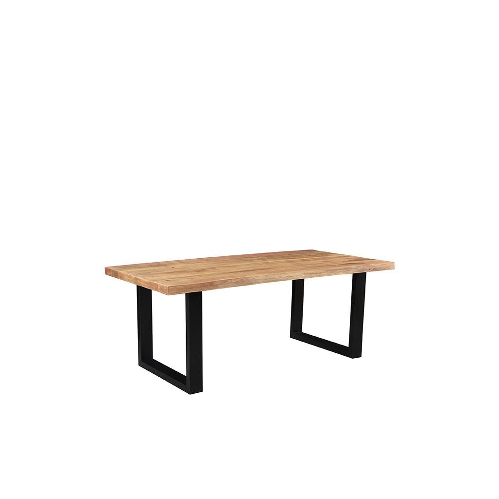 Jídelní stůl ZETH od holandské značky industriálního nábytku LABEL51. Stůl tvoří jídelní deska z masivního mangového dřeva s rozměry 240x100 cm v hnědé barvě. K desce jsou připevněny 2 robustní kovové nohy v tvaru U z černě lakovaného kovu, které stolu zajišťují maximální nosnost a stabilitu. Proti stolu GLASGOW jsou nohy stolu posunuty více na střed a dále od krajů desky.