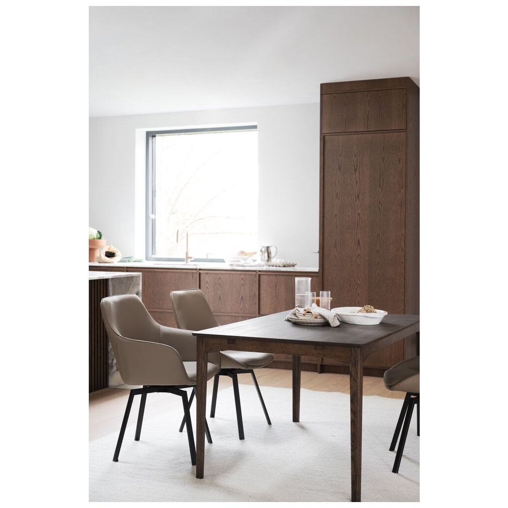 Designová jídelní židle ALISON od švédského designového výrobce nábytku ROWICO. ALISON je čalouněná židle v nádherné béžové kůži s pohodlným sedákem, opěrkou a 2 parádními područkami. Čtyři černě lakované kovové nohy, zajišťují maximální nosnost a stabilitu židle. Židle je otočná o 360 stupňů. Pohodlí je tu na prvním místě.