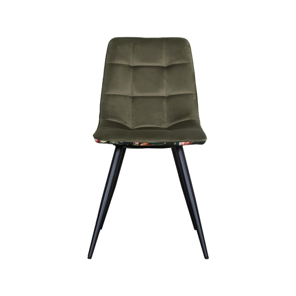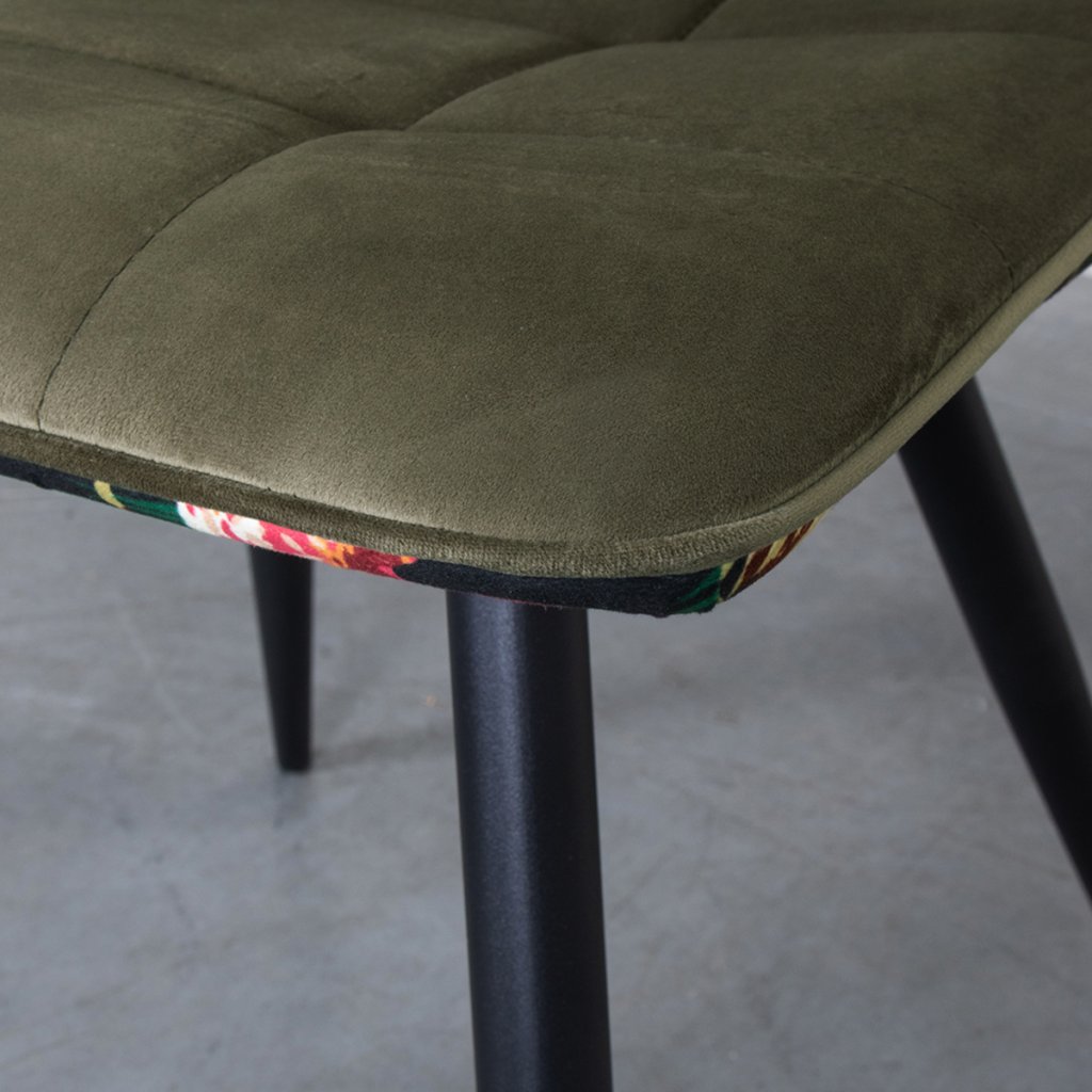 Jídelní židle BISTRO od holandského výrobce industriálního nábytku LABEL51. Židle je postavena na 4 černých kovových nohách, které zajišťují maximální stabilitu a nosnost. Mírně prošívané sedadlo s opěradlem ze sametu v olivové barvě vám zajistí opravdové pohodlí při vašem posezení. Na zadní straně má židle krásný exotický vzor s plameňáky. BISTRO je krásná židle, která kombinuje pohodlí a kultivovanost.