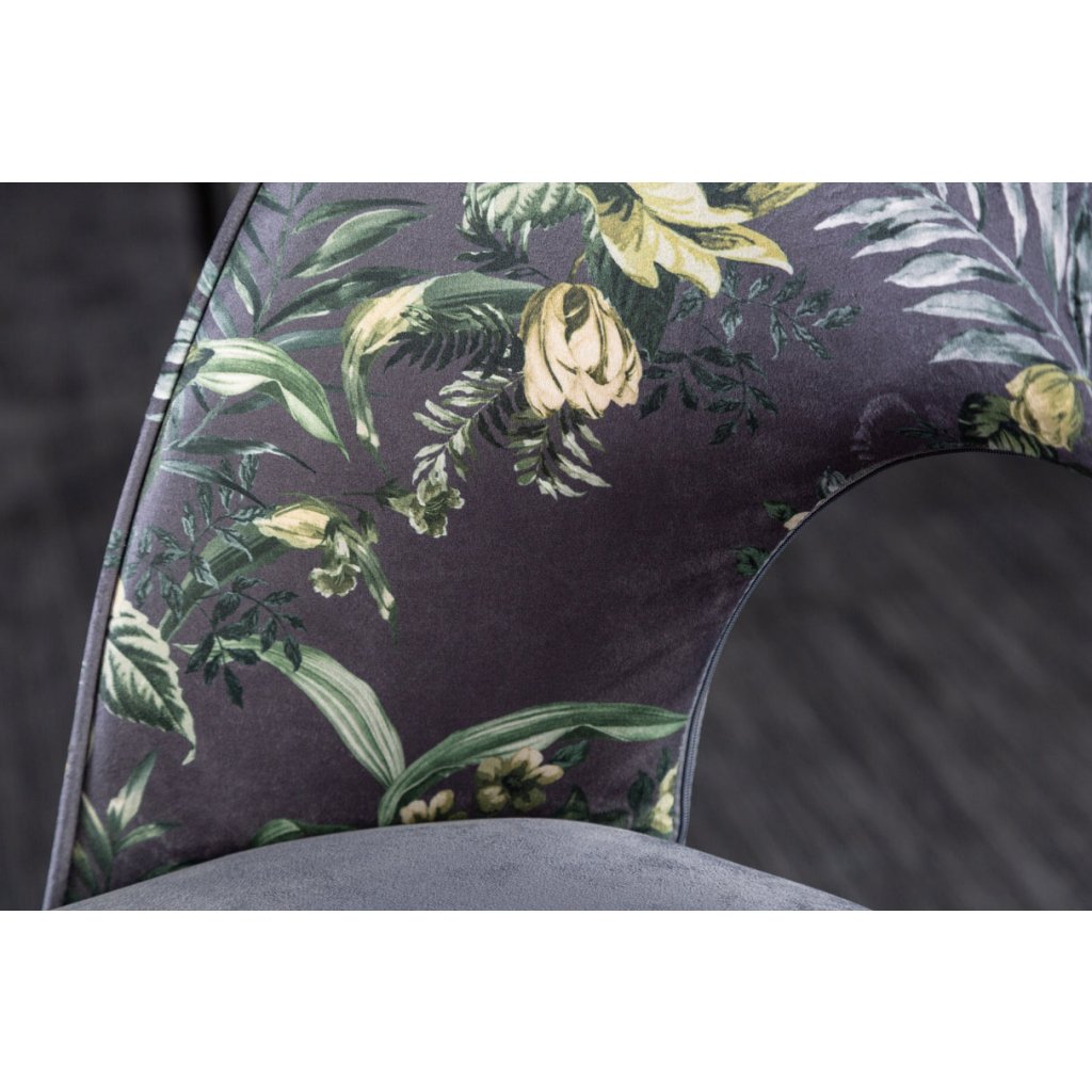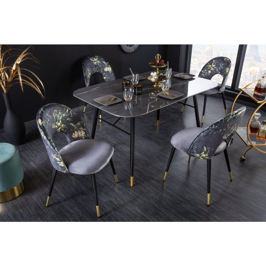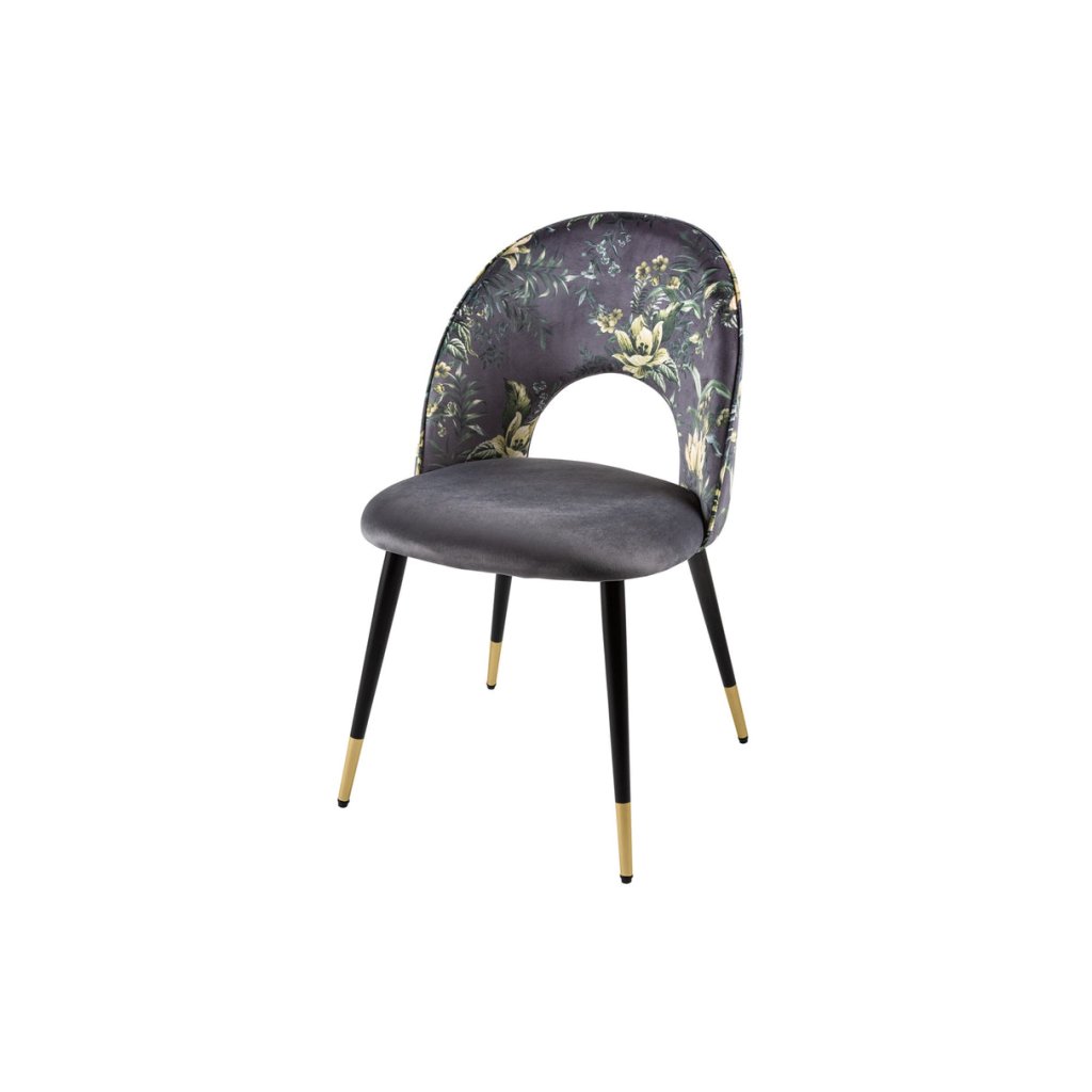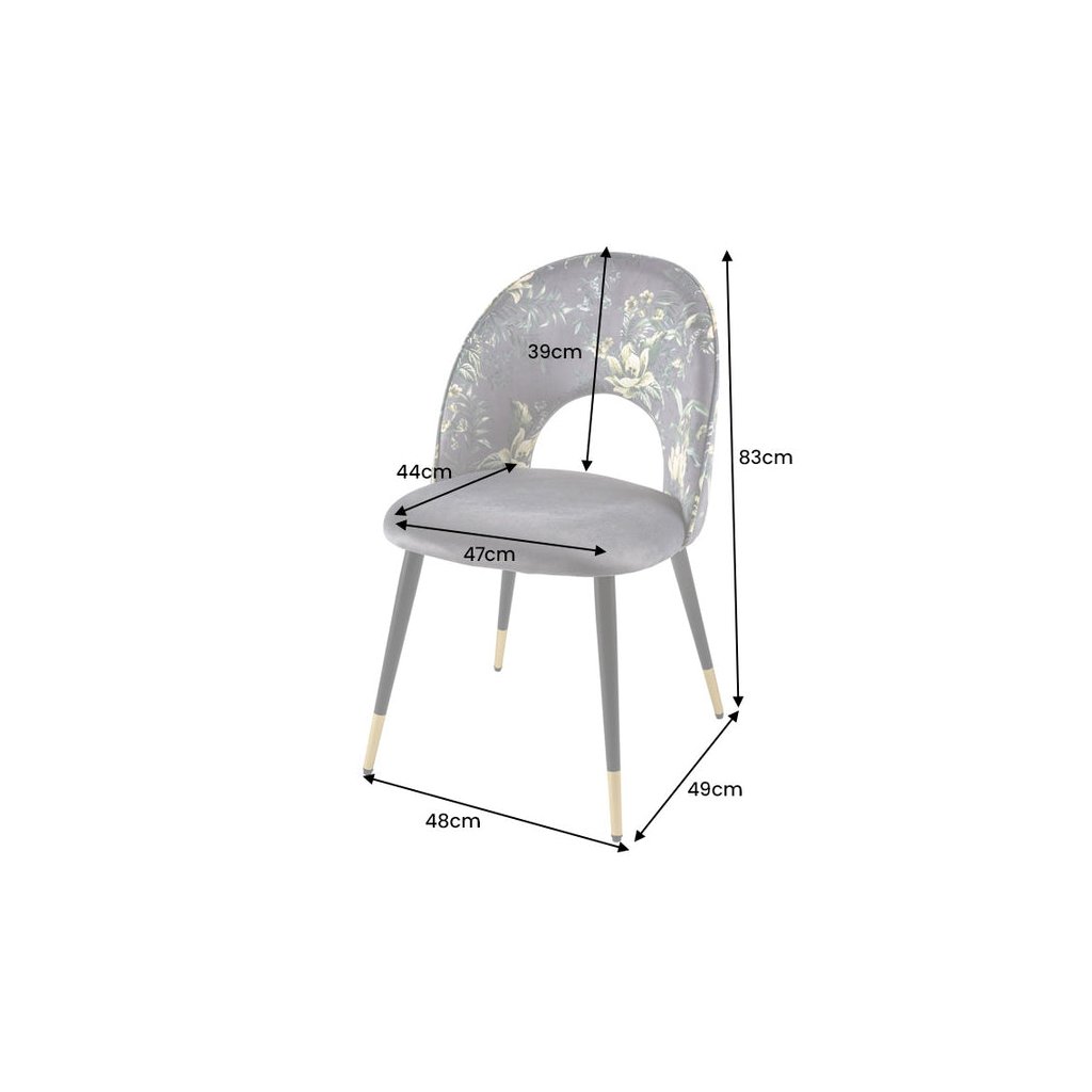 Jídelní židle BOUTIQUE od německé značky krásného nábytku INVICTA. BOUTIQUE přináší do interiéru kombinaci pohodlí, jedinečnosti a elegantního vzhledu. Sedák potažen sametovou látkou v šedém odstínu s květinovým vzorem, která je příjemná na dotek a vhodná pro každodenní používání. Výplň z pěny zajišťuje komfortní sezení, zatímco vnitřní konstrukce z překližky poskytuje stabilní oporu. Kovové nohy v černé barvě se zlatým dekorem dávájí stabilitu, pevnost i styl.