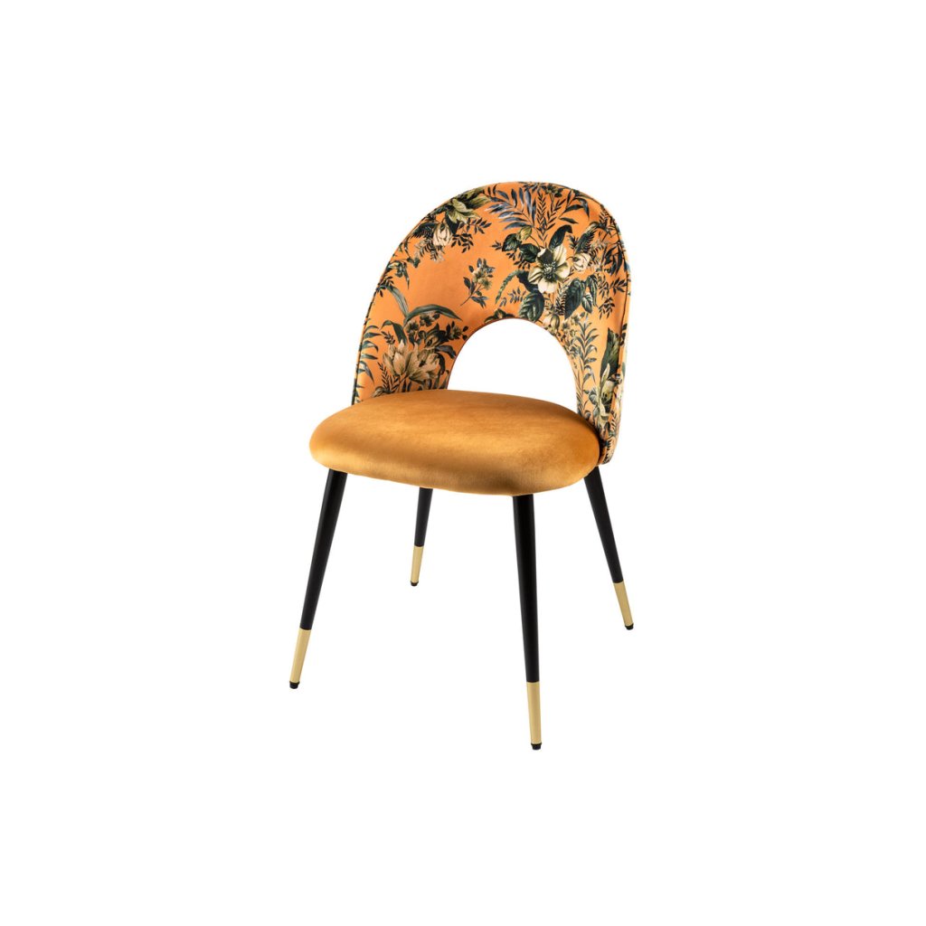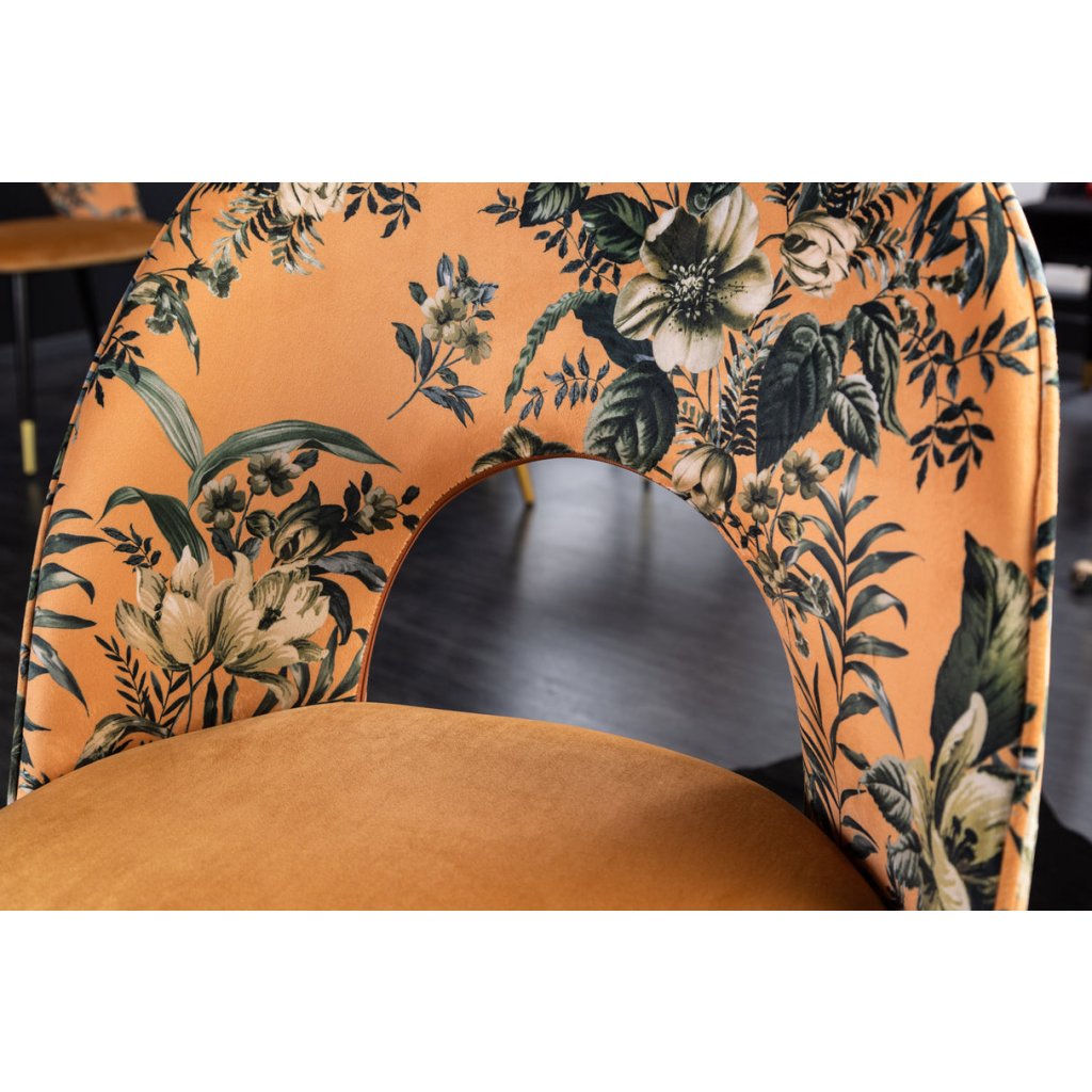 Jídelní židle BOUTIQUE od německé značky krásného nábytku INVICTA. BOUTIQUE přináší do interiéru kombinaci pohodlí, jedinečnosti a elegantního vzhledu. Sedák potažen sametovou látkou v zlatém odstínu s květinovým vzorem, která je příjemná na dotek a vhodná pro každodenní používání. Výplň z pěny zajišťuje komfortní sezení, zatímco vnitřní konstrukce z překližky poskytuje stabilní oporu. Kovové nohy v černé barvě se zlatým dekorem dávájí stabilitu, pevnost i styl.