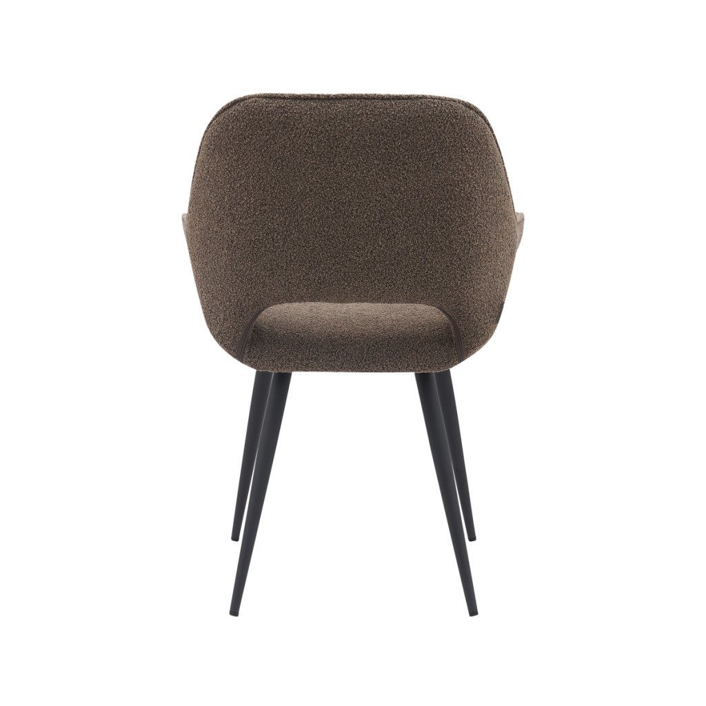 Jídelní židle FER od značky LABEL51 je trendy a pohodlná židle, která dodá vaší jídelně moderní šmrnc. Měkké a strukturované čalounění z látky bouclé dodává židli luxusní vzhled a je velmi příjemné na dotek. Židle se vyznačuje oblými tvary a opěradlem s otevřenou spodní částí (průřezem), což působí vzdušně a zároveň hravě. Elegantní křivka přecházející ze sedáku do područek a opěradla dodává židli šarm a zajišťuje pohodlí. Černé kovové nohy, které mírně vybočují, zajišťují stabilitu a dotvářejí hravý retro nádech.