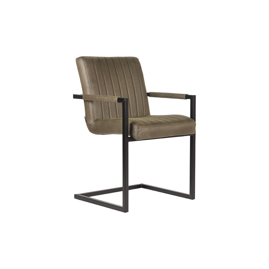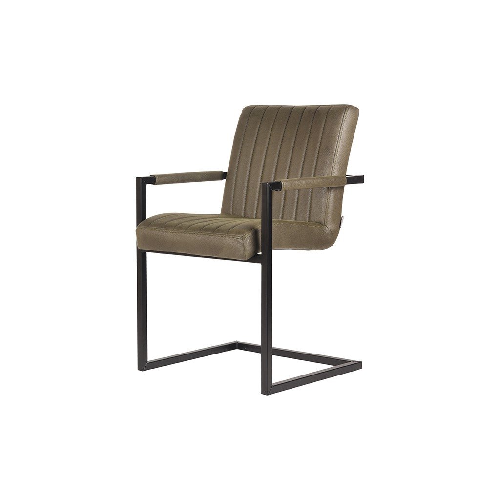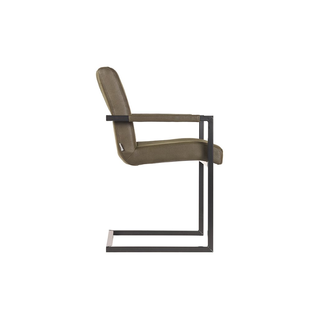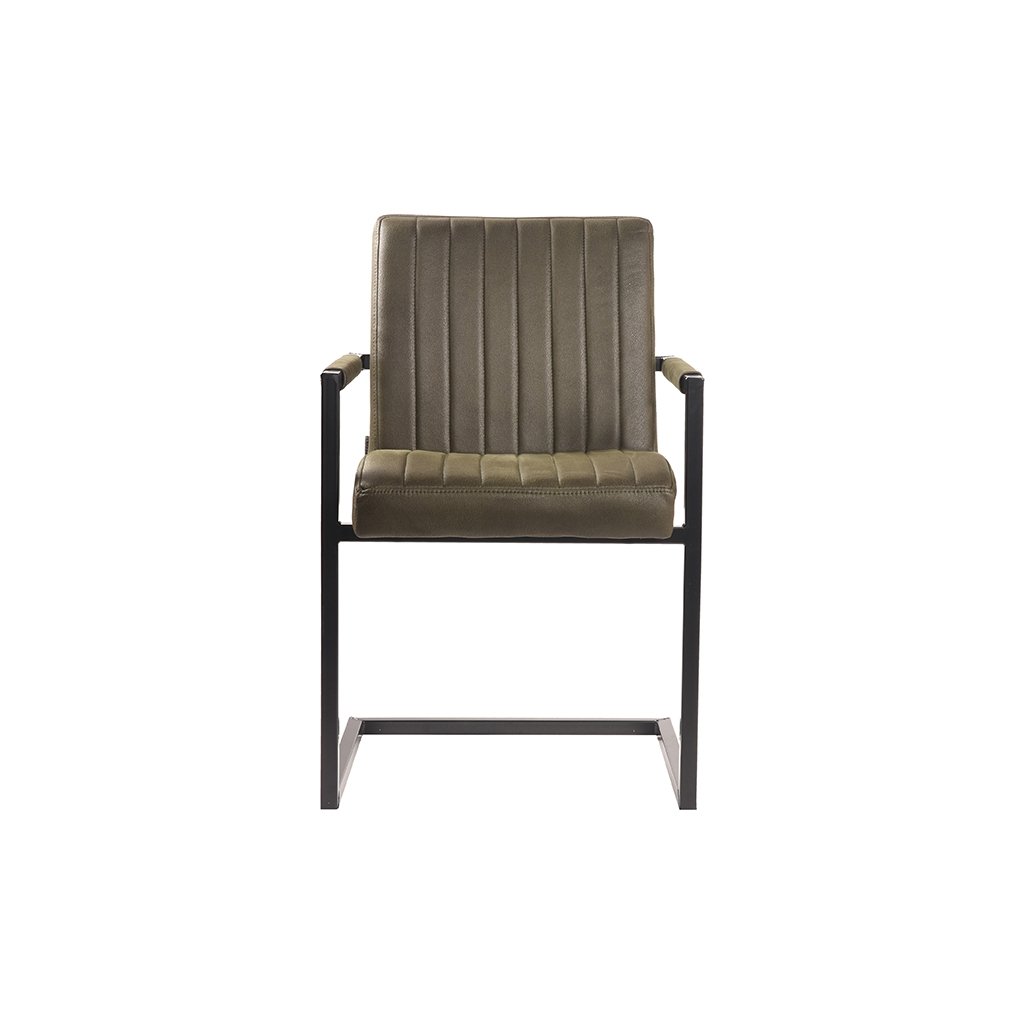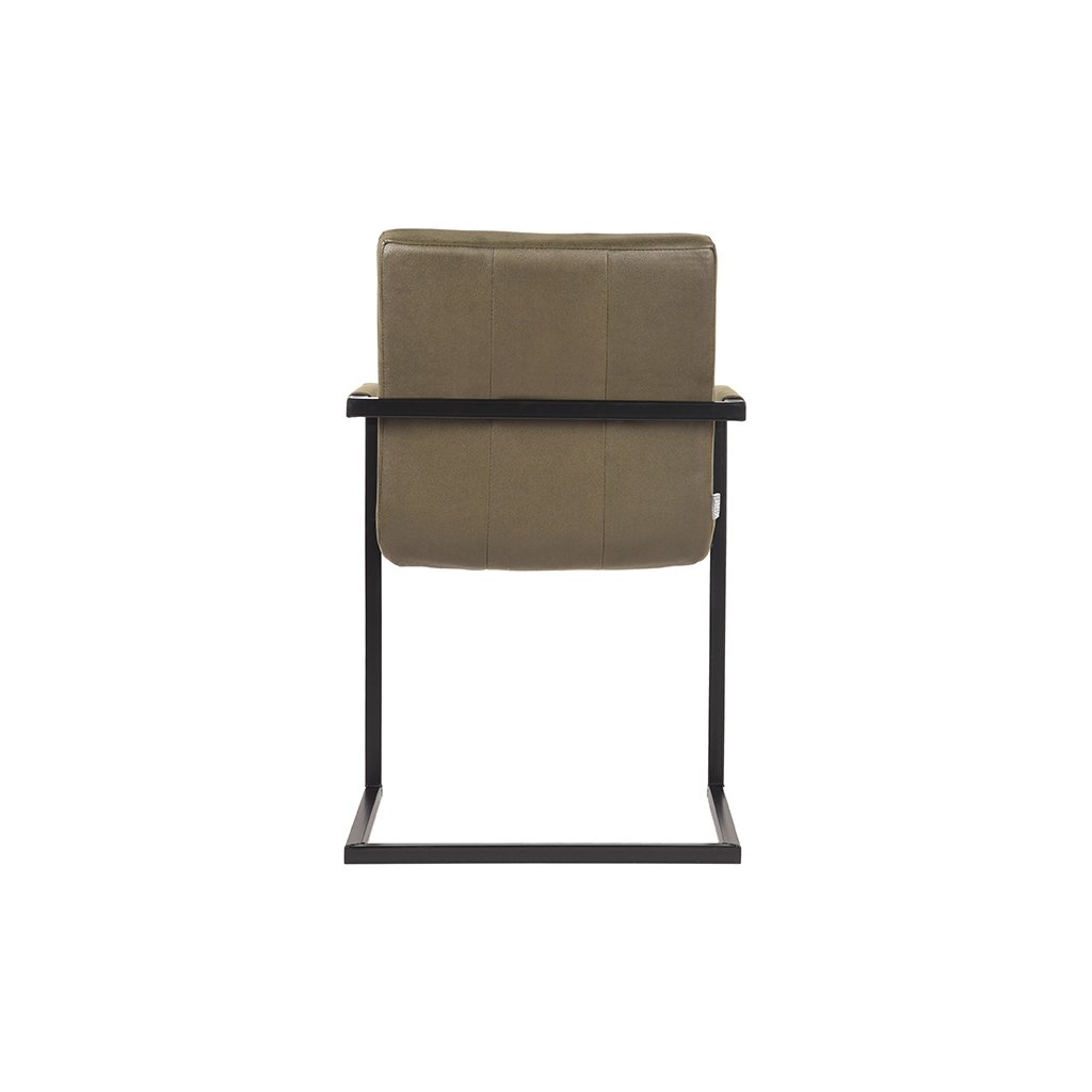 Jídelní židle MILO od holandského výrobce industriálního nábytku LABEL51. MILO je skvělá trendy a velmi pohodlná jídelní židle v barvě armádní zelené s černými nožičkami. Sedák a opěradlo ze zeleného mikrovlákna mají svislé prošívaní. Zajímavostí židle je černá kovová konzolová konstrukce, obsahující područky, které jsou dodávány také v provedení z mikrovlákna.