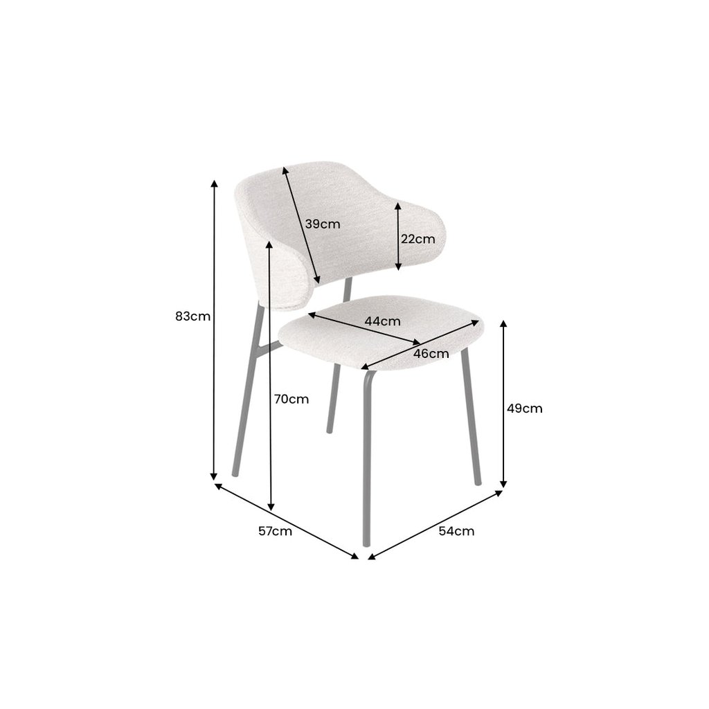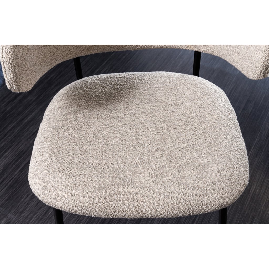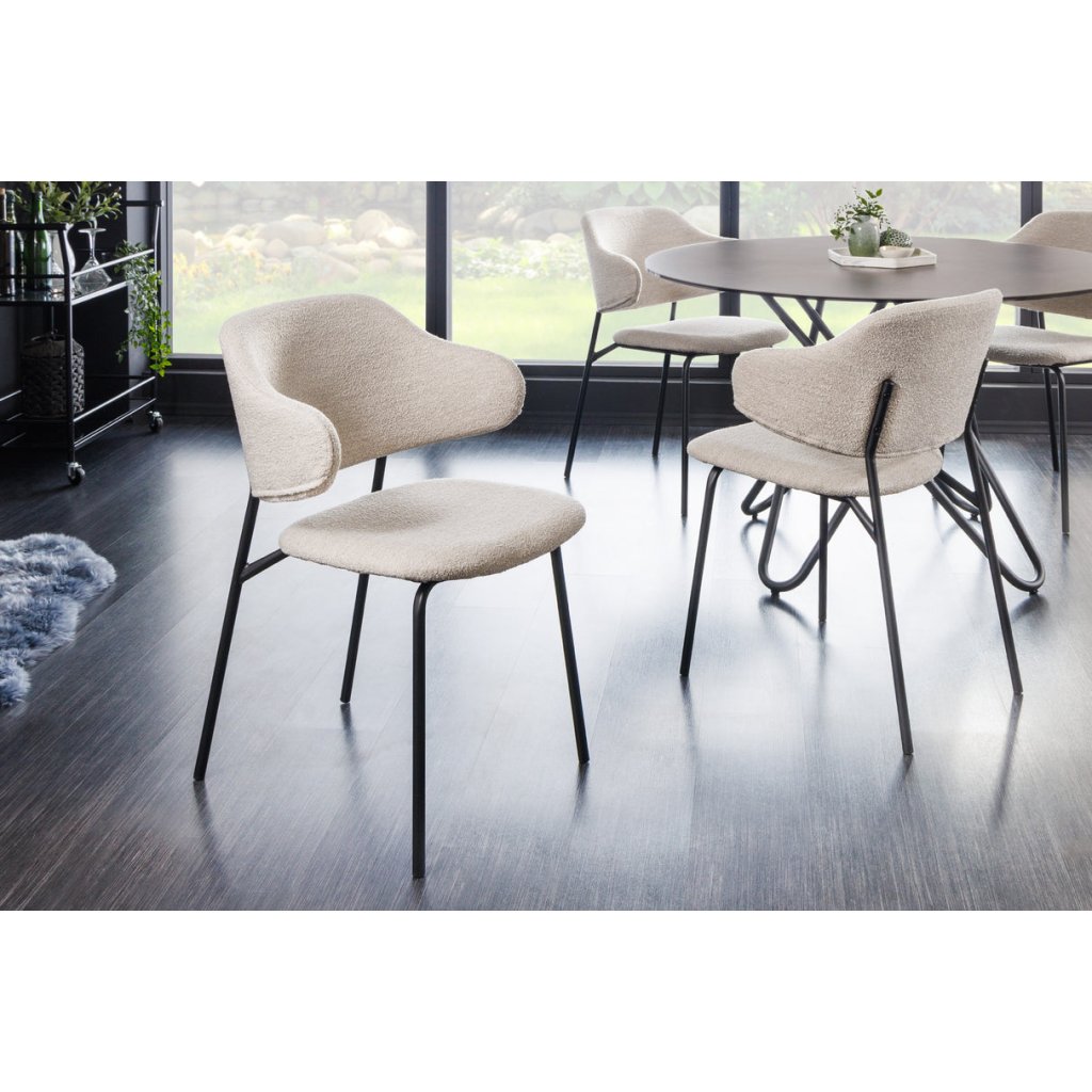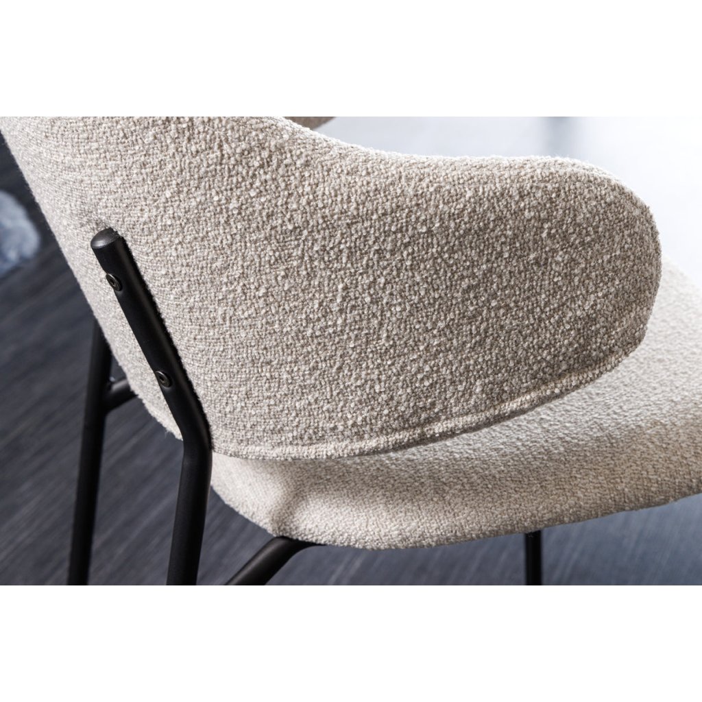 Jídelní židle TRACY od německé značky krásného nábytku INVICTA. TRACY přináší do interiéru kombinaci pohodlí, lehkosti a elegantního vzhledu. Sedák potažen bouclé látkou v béžovém odstínu, která je příjemná na dotek, pevná a vhodná pro každodenní používání. Výplň z pěny zajišťuje komfortní sezení, zatímco vnitřní konstrukce z překližky poskytuje stabilní oporu. Kovové nohy pokračující výše do opěrky a dodávají židli přírodní vzhled a zároveň zaručují pevnost a dlouhou životnost.