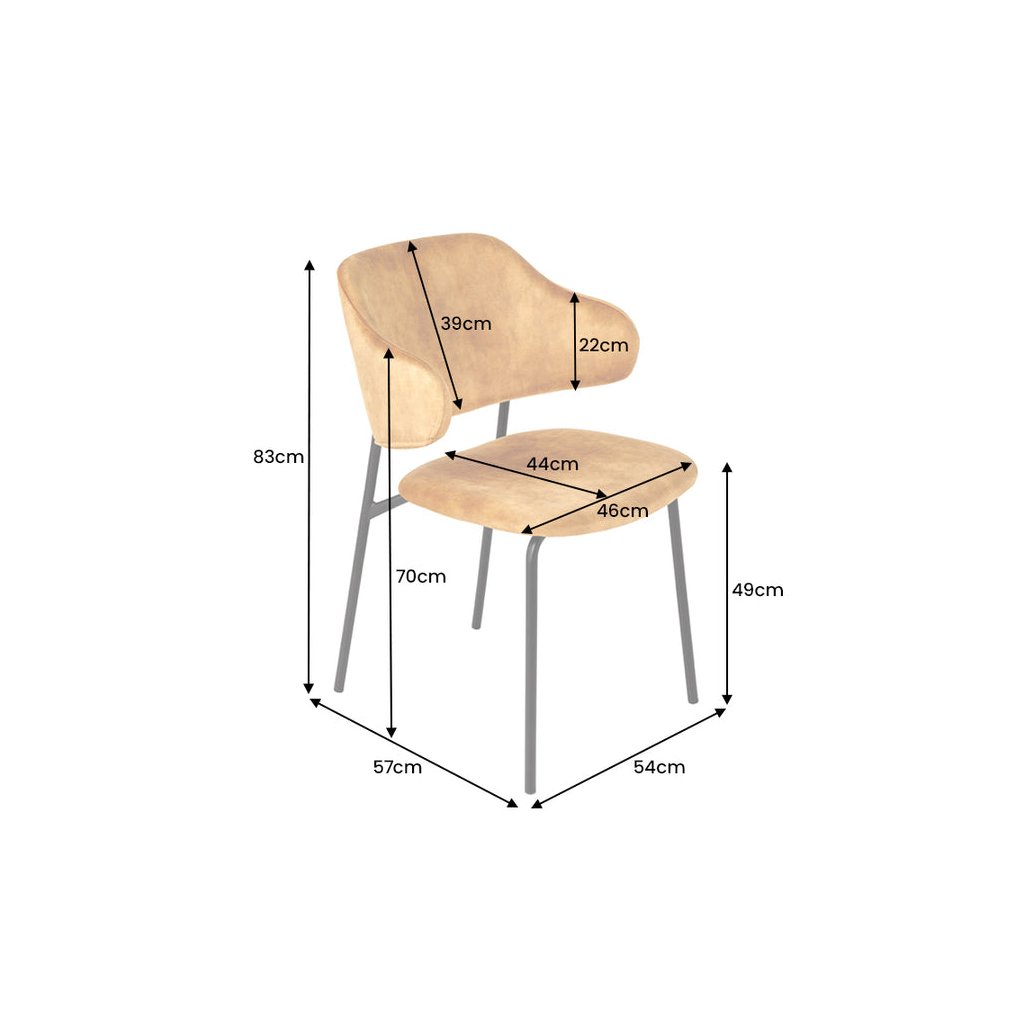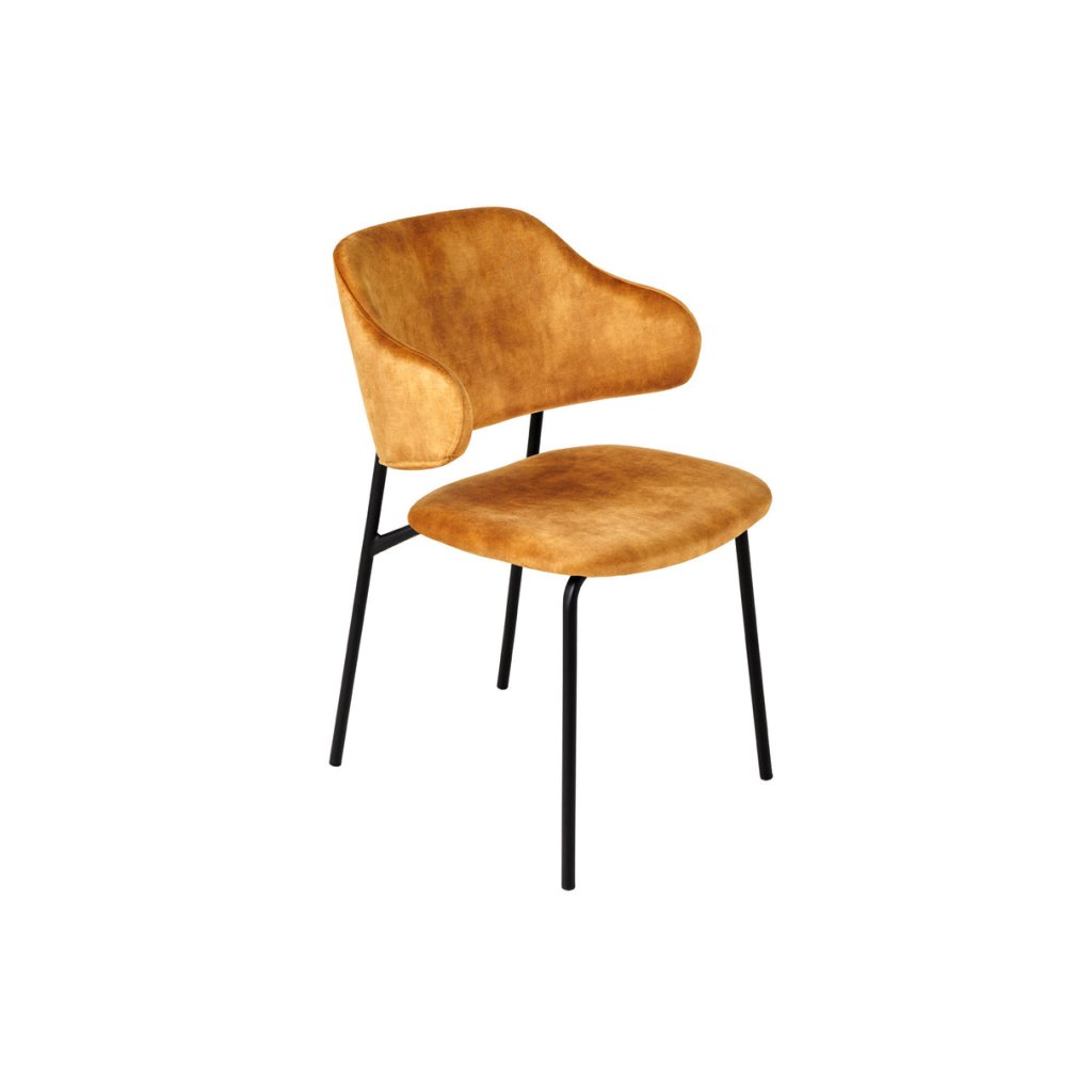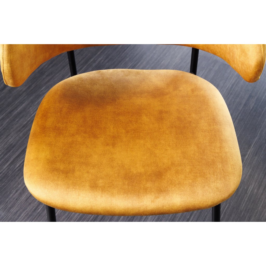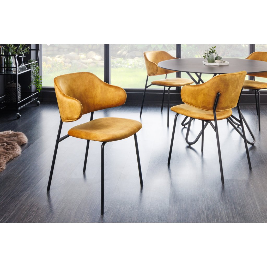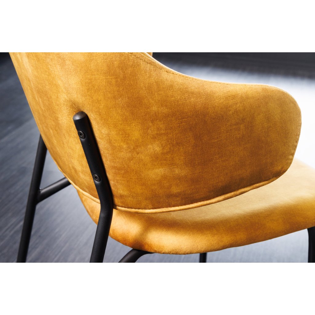 Jídelní židle TRACY od německé značky krásného nábytku INVICTA. TRACY přináší do interiéru kombinaci pohodlí, lehkosti a elegantního vzhledu. Sedák potažen sametovou látkou v hořčičném odstínu, která je příjemná na dotek a vhodná pro každodenní používání. Výplň z pěny zajišťuje komfortní sezení, zatímco vnitřní konstrukce z překližky poskytuje stabilní oporu. Kovové nohy pokračující výše do opěrky a dodávají židli přírodní vzhled a zároveň zaručují pevnost a dlouhou životnost.
