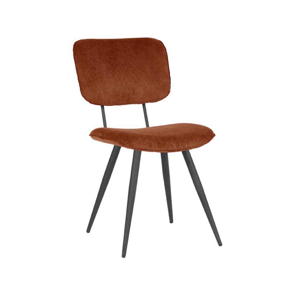 Jídelní židle VIC od holandského výrobce industriálního nábytku LABEL51. Sedák a oddělené opěradlo jsou z ribcordu, potahu s proužky, v oranžové barvě. Moderní židle s elegantním a robustním vzhledem. VIC je vytvořena z velmi kvalitního materiálu, který poskytuje extra pohodlí. Čtyři černé kovové nohy zajišťují židli maximální nosnost a stabilitu.