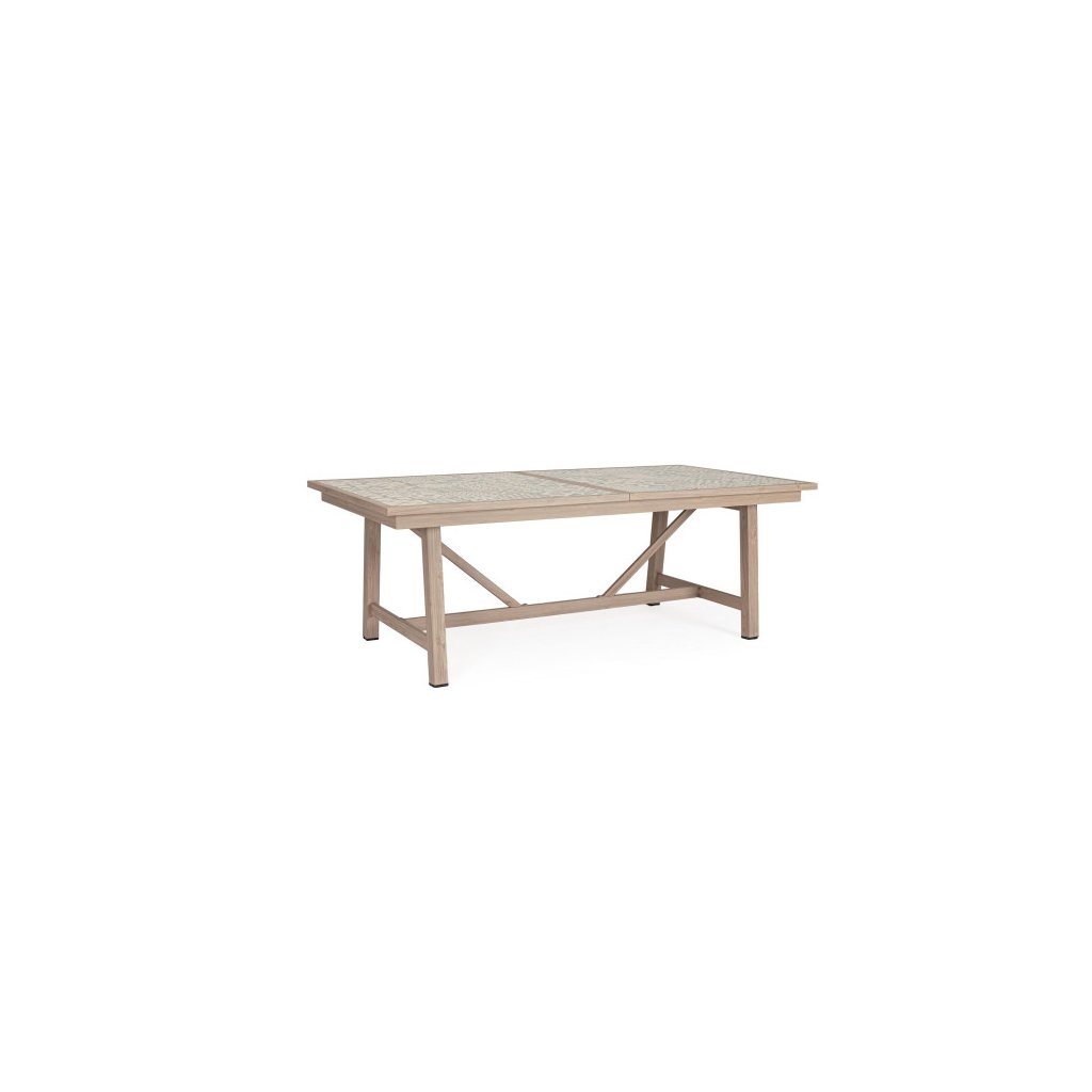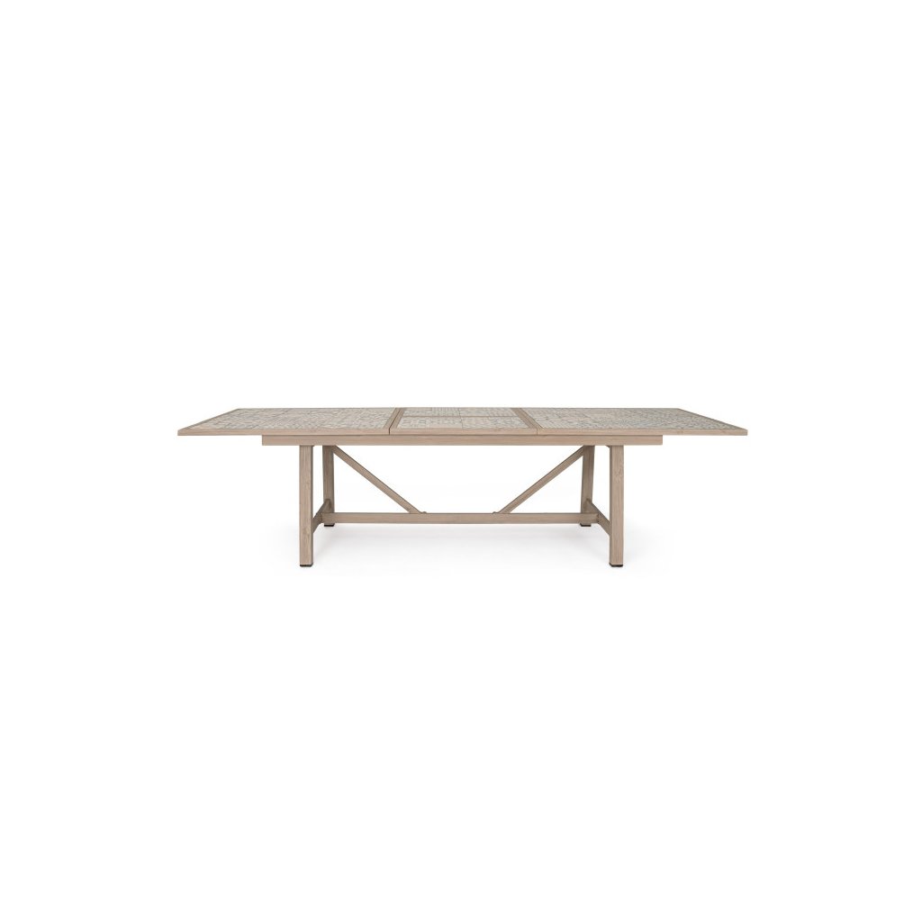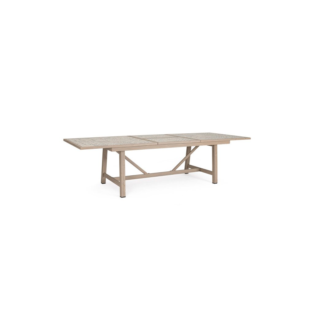 Stylový zahradní stůl KALIMERA od italského výrobce stylového nábytku BIZZOTTO. Krásný a unikátní jídelní stůl je vyrobený z práškového hliníku v imitaci dřeva ve světlé barvě. Hranatá deska stolu 212x106 cm je pak dodávána z jednotlivých keramických dlaždiček v jižanské podobě, tzv PATCHWORK. Stůl se dá rozložit na délku 285x106cm a pojme tak celou velkou rodinu. Naprosto parádní stůl, který rozzáří vaši zahradu a dodá ji hravé barvy.