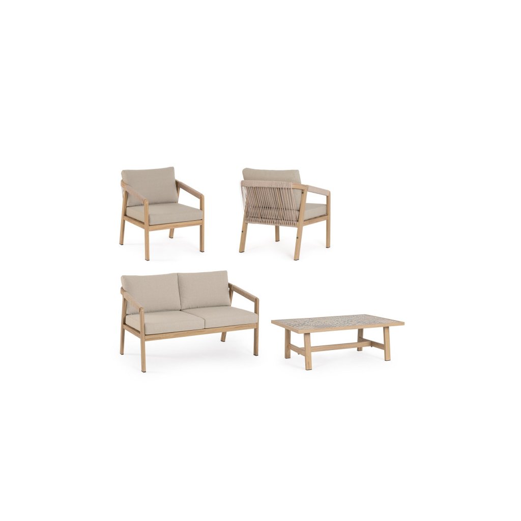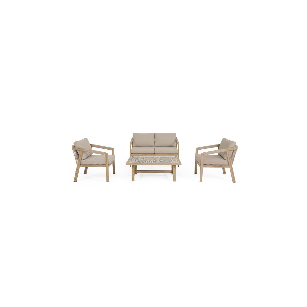 Designový zahradní set KALIMERA od italského výrobce stylového nábytku BIZZOTTO. Zahradní sestavu tvoří dvoumístná pohovka, 2 křesla a konferenční stolek. Celá sestava je vyrobena především z lehkého hliníku s jemným efektem dřeva v teplé hnědé barvě. Pohovka a křesla mají sedací a opěrné polštářky ze šedého olefinu, který je odolný UV záření a vodě. Příjemné vám budou i boční područky u obou. Díky materiálu hliníku jsou odolné a lehké na manipulaci. Konferenční stolek má stylové španělské keramické kachličky a dodává jedinečnost.
