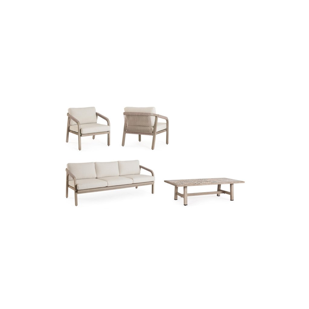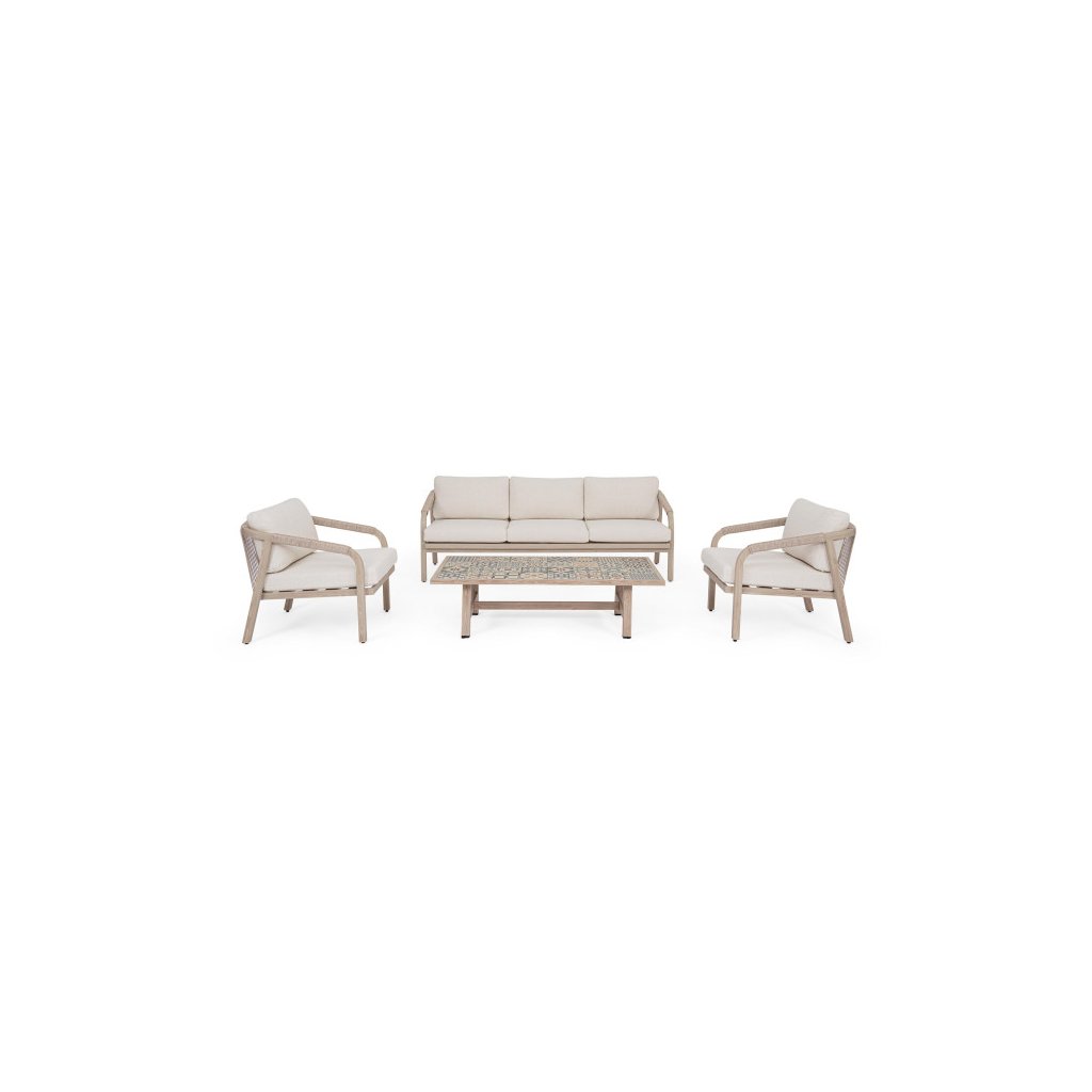Designový zahradní set KALIMERA od italského výrobce stylového nábytku BIZZOTTO. Zahradní sestavu tvoří třímístná pohovka, 2 křesla a konferenční stolek. Celá sestava je vyrobena především z lehkého hliníku s jemným efektem dřeva ve světlé barvě. Pohovka a křesla mají sedací a opěrné polštářky ze světlého olefinu, který je odolný UV záření a vodě. Příjemné vám budou i boční područky u obou. Díky materiálu hliníku jsou odolné a lehké na manipulaci. Konferenční stolek má stylové španělské keramické kachličky a dodává jedinečnost.