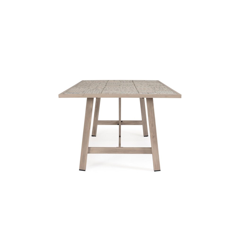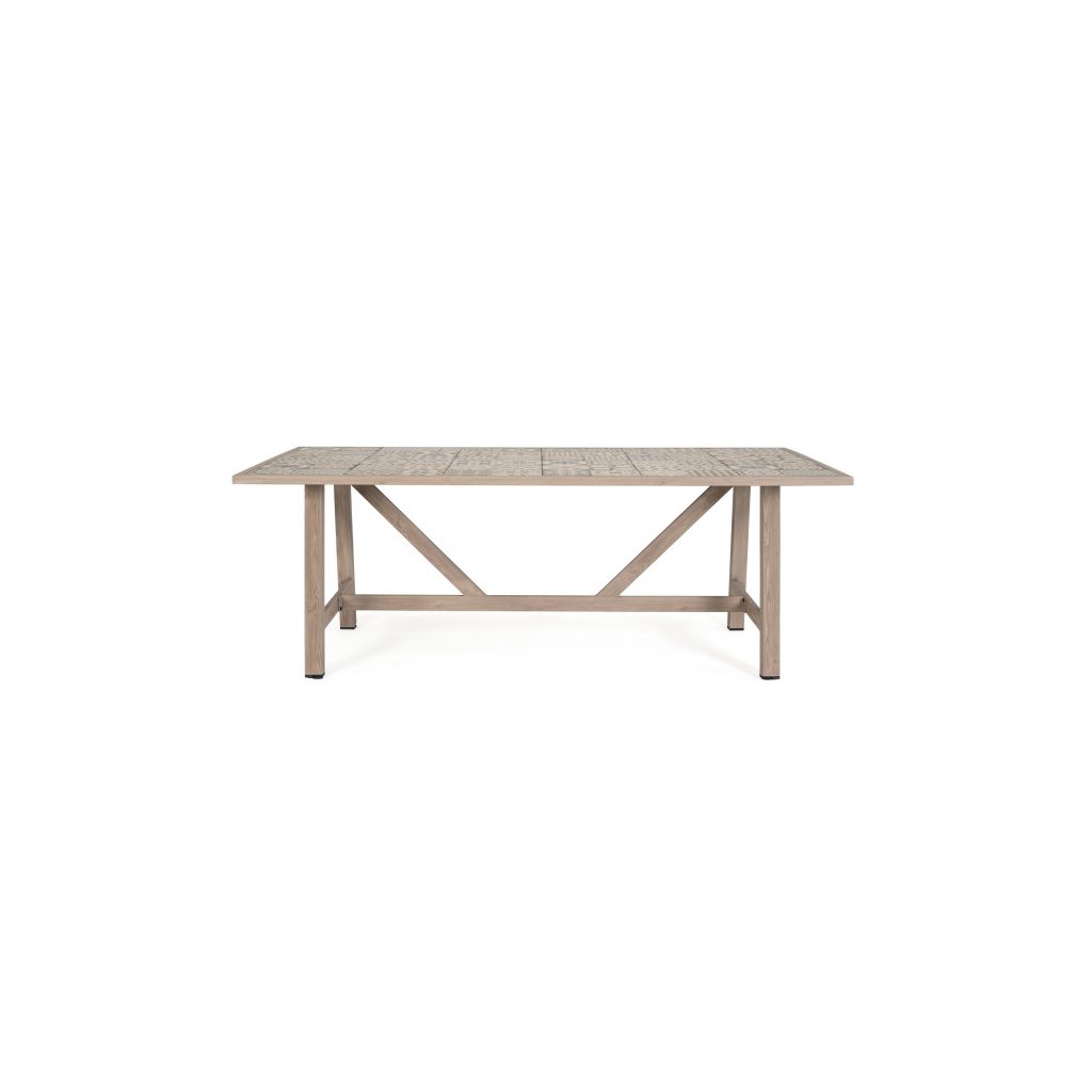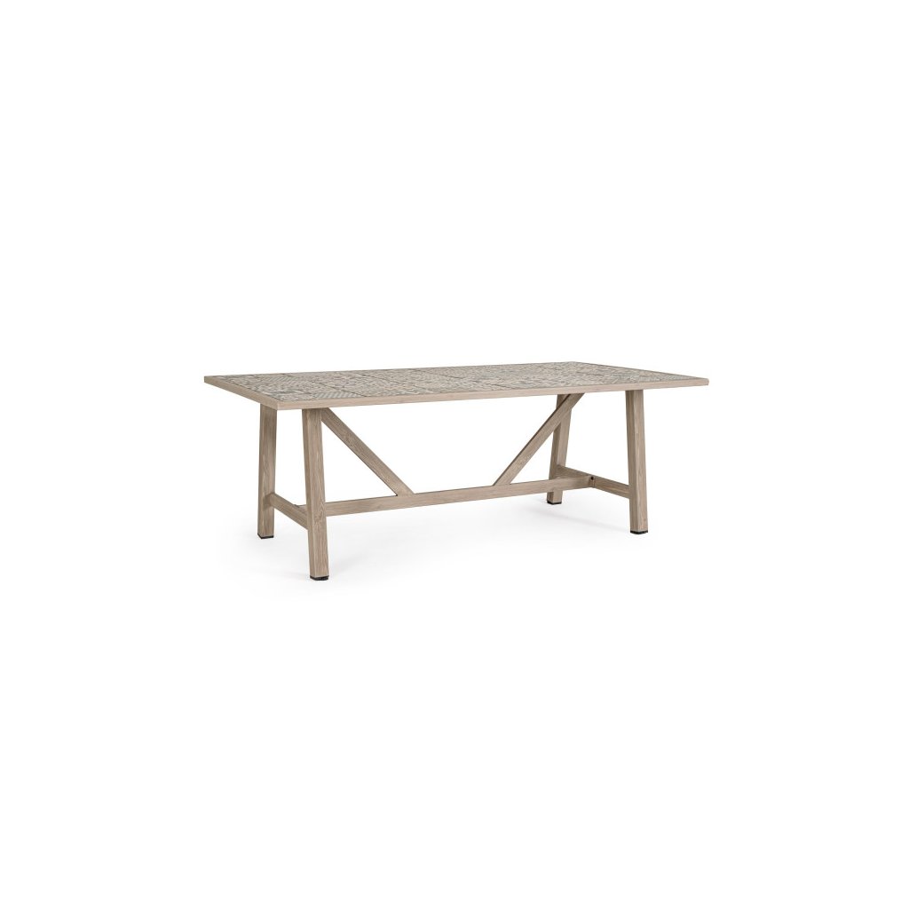 Stylový zahradní stůl KALIMERA od italského výrobce stylového nábytku BIZZOTTO. Krásný a unikátní jídelní stůl je vyrobený z práškového hliníku v imitaci dřeva ve světlé barvě. Hranatá deska stolu 206x106 cm je pak dodávána z jednotlivých keramických dlaždiček v jižanské podobě, tzv PATCHWORK. Naprosto parádní stůl, který rozzáří vaši zahradu a dodá ji hravé barvy.