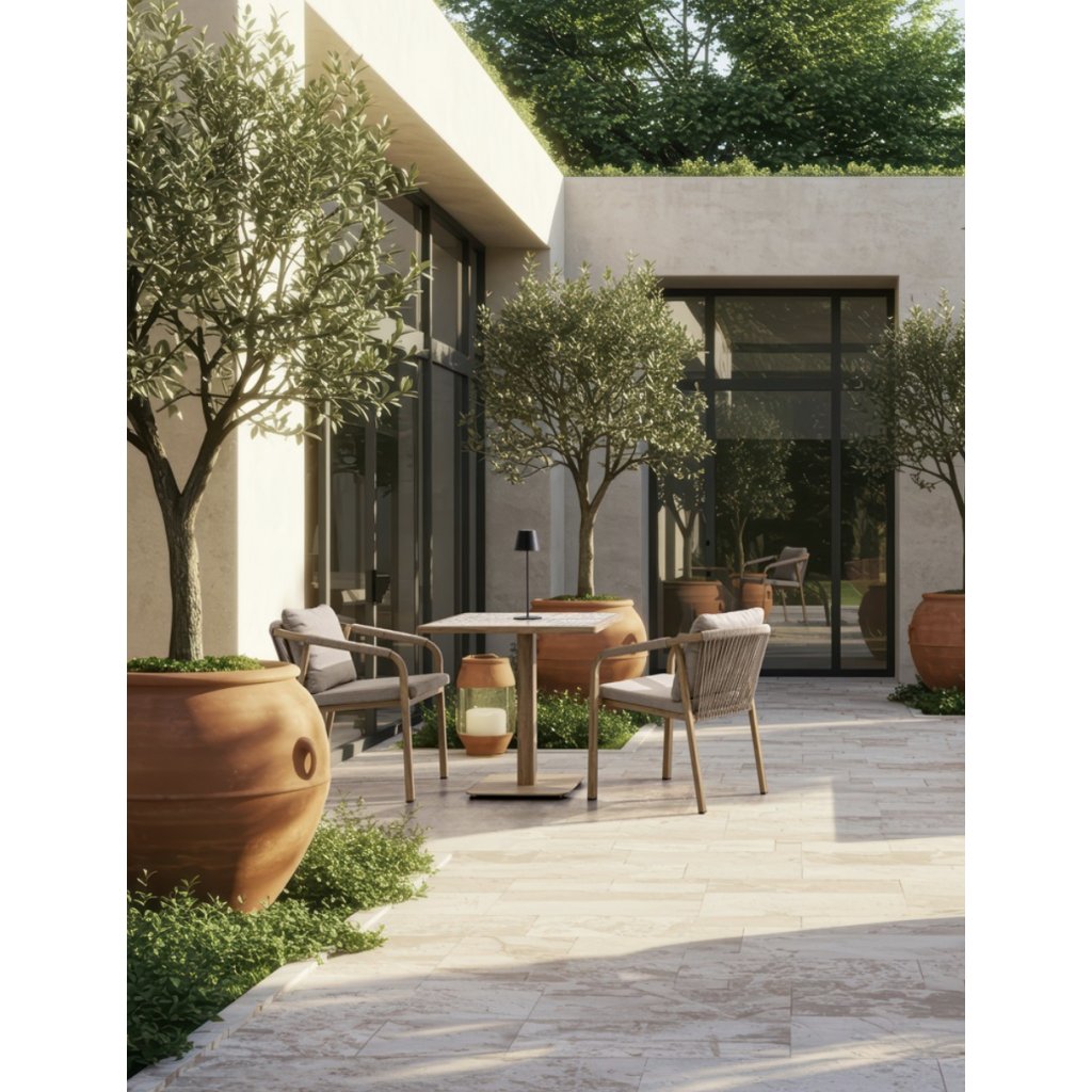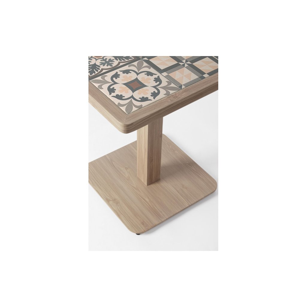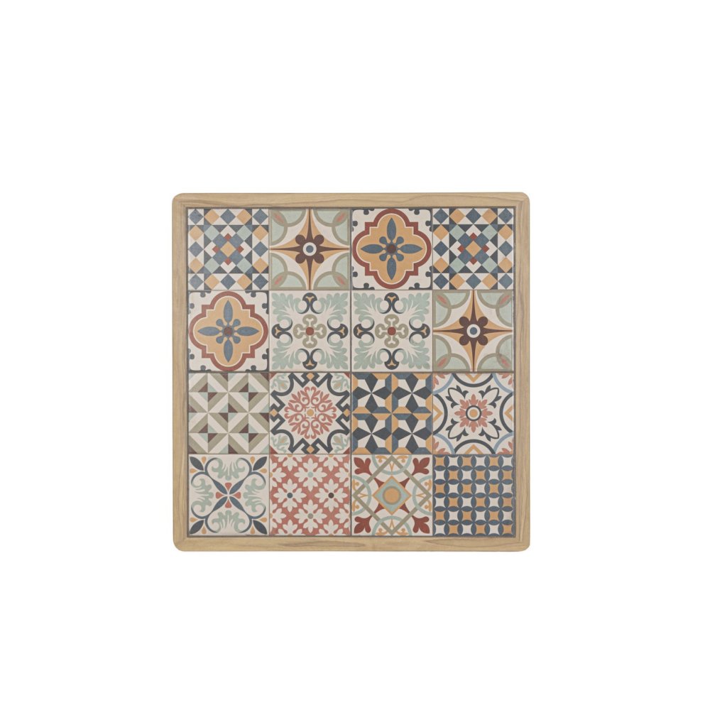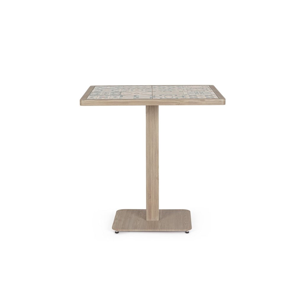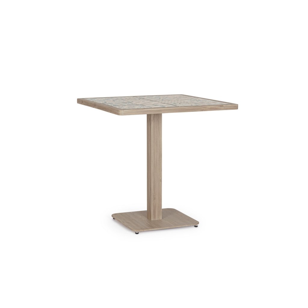 Stylový zahradní stolek KALIMERA od italského výrobce stylového nábytku BIZZOTTO. Krásný a jednoduchý stůl je vyrobený z práškového hliníku v imitaci dřeva ve světlé barvě. Hranatá deska stolu 73x73 cm je dodávána z jednotlivých keramických dlaždiček v jižanské podobě, tzv PATCHWORK. Ideální jak do kaváren, restaurací a hotelů, tak i také domů.