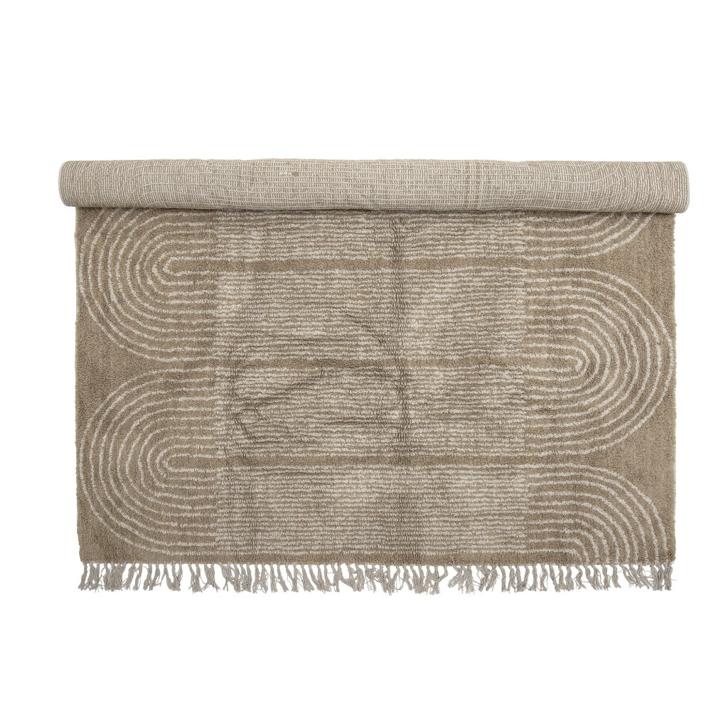 Stylový a krásný koberec ZEYNEP dánské značky nádherného nábytku BLOOMINGVILLE. Tento koberec ZEYNEP je vyroben z hnědé bavlny se zajímavými a krásnými geometrickými tvary vlnek se světlejší barvou. Díky průměru 215x150 cm vám udělá velkou radost ve vašem obývacím pokoji u pohovky a konferenčního stolku. Velmi příjemný na dotek a na holé nohy.