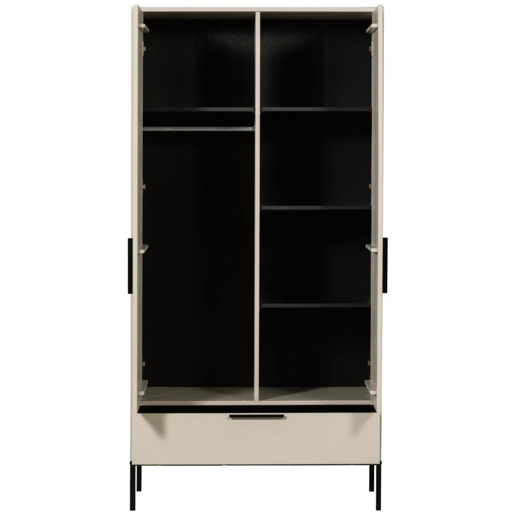 Stylová skříň ADAM od holandského výrobce nábytku WOOOD. ADAM je vyrobena z borovicového dřeva s krásným světlým odstínem. Robustní dvoudveřová skříň obsahuje širokou zásuvku, závěsnou část s tyčí v levé části a police vpravo. Komoda je ošetřena ekologickým lakem a vodní bázi. Základna a rukojeti jsou stylově upraveny matnou černou práškovou barvou. ADAM je stylovým doplňkem do vaší ložnice nebo šatny. Použitý materiál byl získán ekologicky a pyšní se certifikátem FSC.