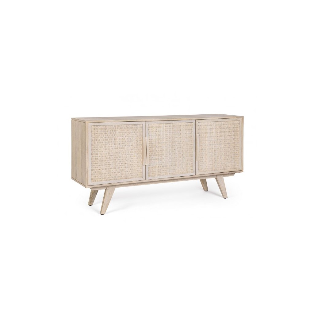 Designová dřevěná komoda SAHANA od italského výrobce stylového nábytku BIZZOTTO. Stylová a krásná komoda SAHANA je vyrobena převážně z masivního mangového dřeva se světlým bílým pigmentem. Komoda má 3 do strany otevírací dvířka, které jsou tvořeny především výpletem z přírodního a světlého ratanu. Díky tomuto provedení vyniká SAHANA svým netradičním a originálním vzhledem.
