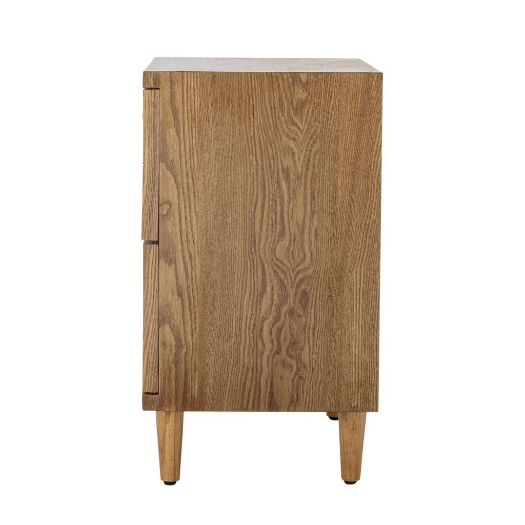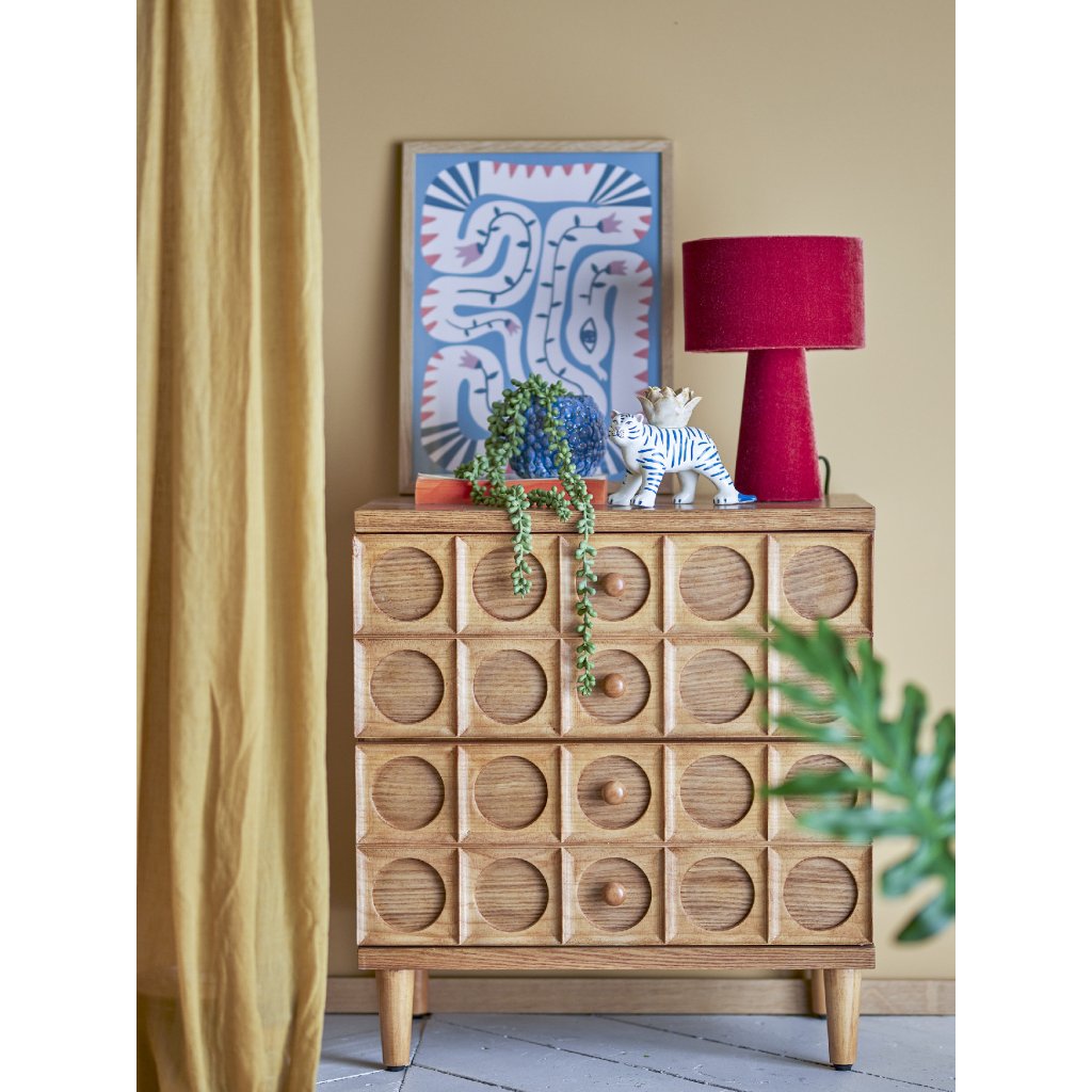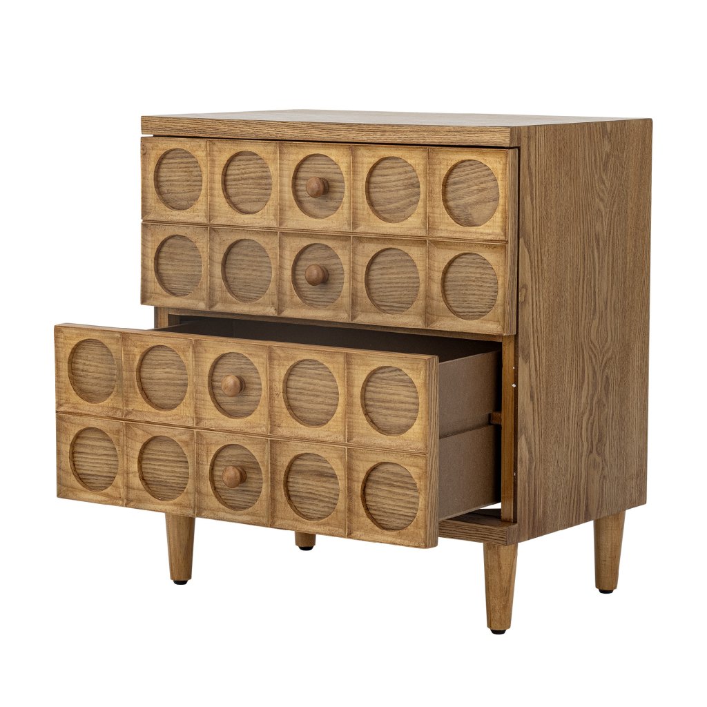 Designová komoda VESTER od dánského výrobce nádherného nábytku BLOOMINGVILLE. VESTER je kompaktní a stylový kousek nábytku, který spojuje funkčnost s estetickým designem. Je vyrobena převážně z MDF v přírodní hnědé barvě a zaujme vás svým jemným geometrickým vzorem na čele zásuvek, který dodává hloubku a strukturu. Dvě prostorné zásuvky nabízejí praktické úložné možnosti, zatímco úchytky s mosazným vzhledem celkový vzhled povyšují a dodávají nádech elegance.