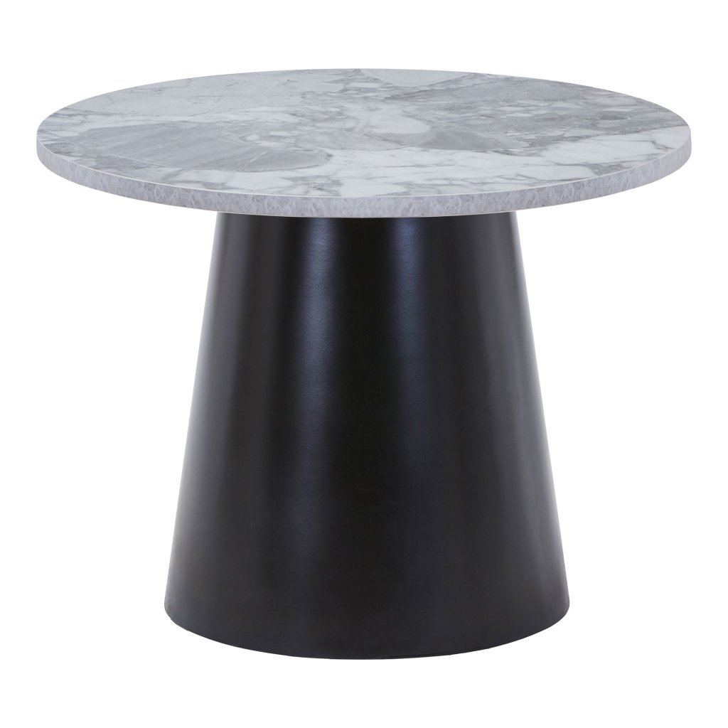 Designový konferenční stolek BRITO od dánské značky nádherného skandinávského nábytku HOUSE NORDIC. Stolek tvoří krásná vrchní kulatá deska se vzhledem mramoru. Deska má průměr 60 cm a je vyrobena z kombinace mdf dřevovláknité desky, melaminu a oceli. Deska je usazena na 1 masivní kuželovité noze ze dřeva To vše vytváří nádherně a luxusně vypadající krásný konferenční stůl.