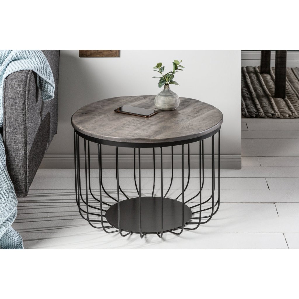 Designový konferenční stolek FACTORY od německé značky designového nábytku INVICTA. Stolek FACTORY je krásný reprezentant industriálu, který kombinuje kovovou spodní část z jednotlivých tyček v černé barvě a vrchní kulatou desku z masivního mangového dřeva s průměrem 60 cm v šedé barvě.