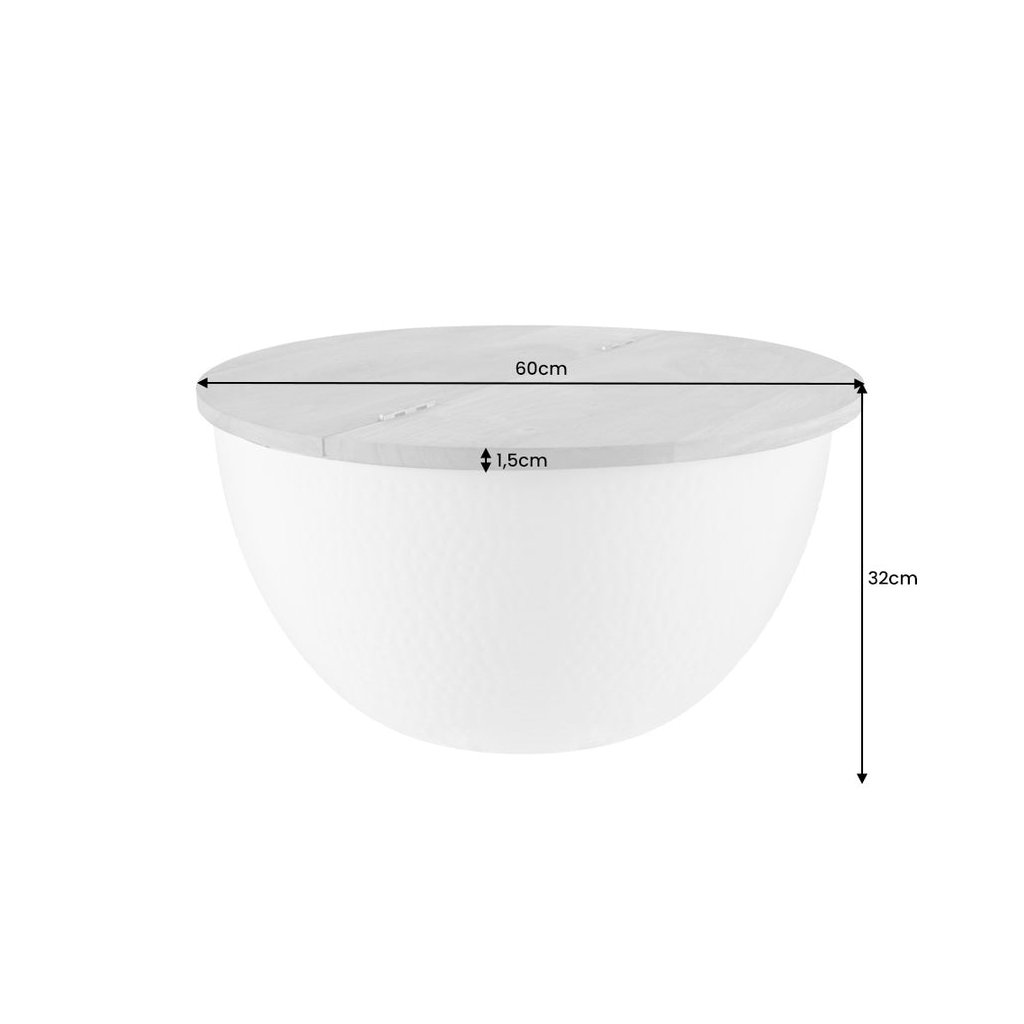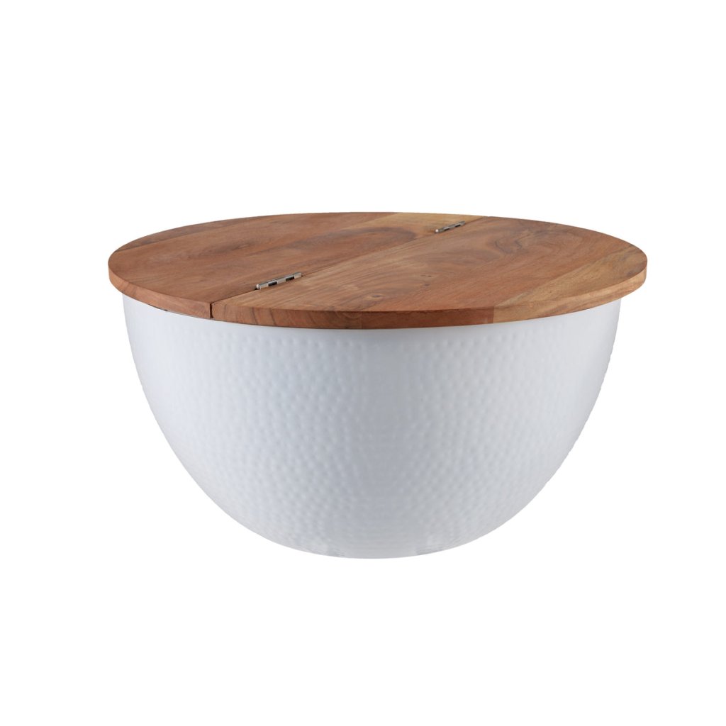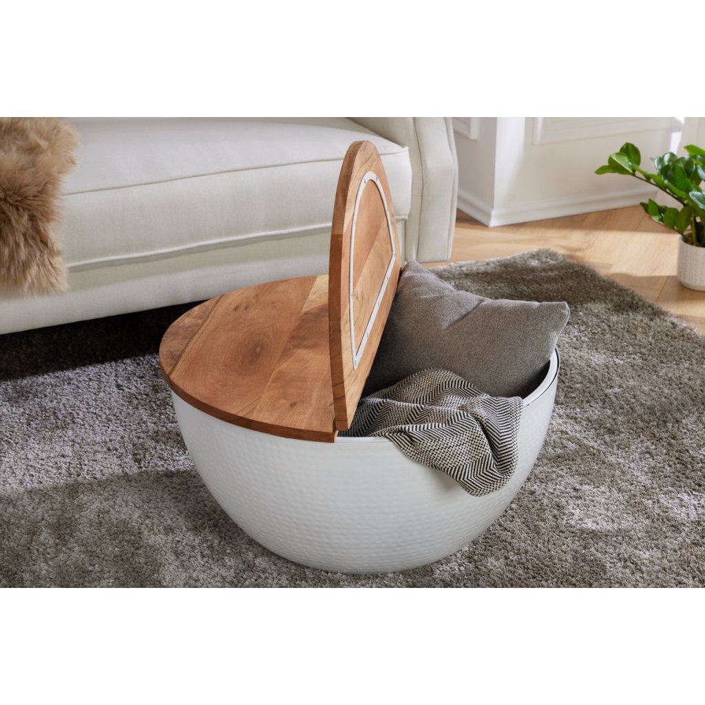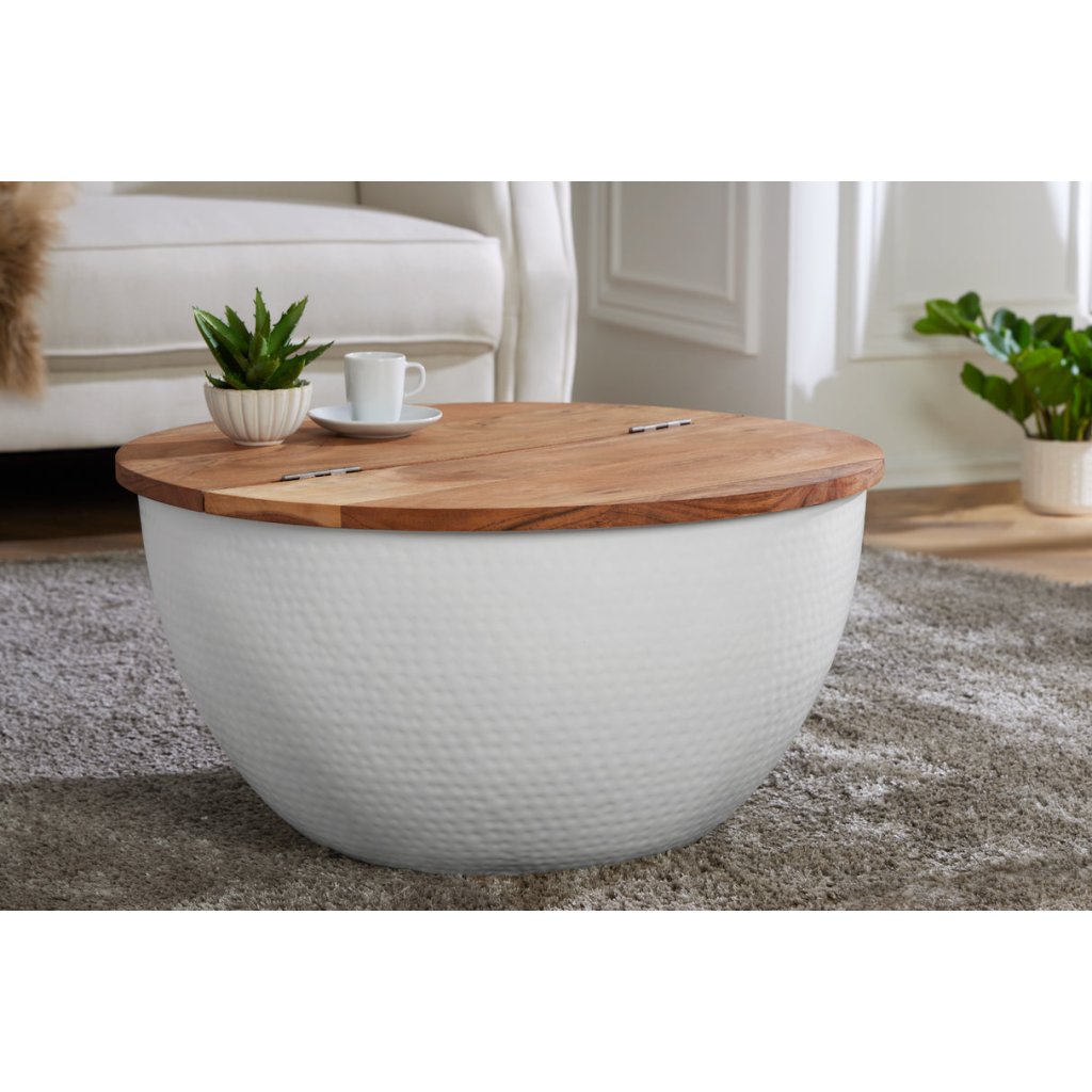 Designový konferenční stolek ORIENT od německé značky designového nábytku INVICTA. Stolek je opravdu nádherný výrobek, který je ručně vyroben z hliníkového plechu v bílém provedení a jednotlivými díry po údery kladivem. Díky průměru 60 cm poskytujete dostatek prostoru na kávu, TV ovladač a další potřebnosti. Vrchní deska je z masivní akácie, lze odklopit a tím získáte úložný prostor uvnitř. K dostání i v dalších barvách kovu.