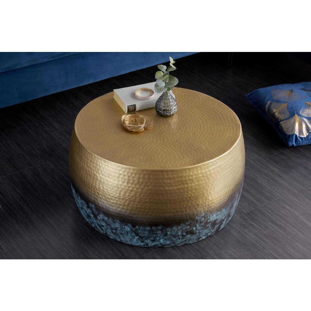 Designový konferenční stolek ORIENT od německé značky designového nábytku INVICTA. Stolek je opravdu nádherný výrobek, který je ručně vyroben z hliníkového plechu v zlatém provedení s patinou a jednotlivými díry po údery kladivem. Díky průměru 60 cm poskytujete dostatek prostoru na kávu, TV ovladač a další potřebnosti. Hliník je velmi lehký a tak nebude těžké se stolkem manipulovat.