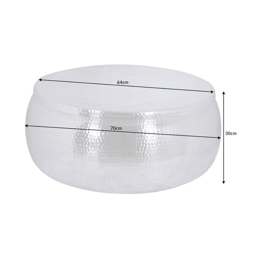 Designový konferenční stolek ORIENT od německé značky designového nábytku INVICTA. Stolek je opravdu nádherný výrobek, který je ručně vyroben z hliníkového plechu v blyštivě stříbrném provedení a jednotlivými díry po údery kladivem. Díky průměru 70 cm poskytujete dostatek prostoru na kávu, TV ovladač a další potřebnosti. Hliník je velmi lehký a tak nebude těžké se stolkem manipulovat. K dostání v jiných barvách a velikostech.