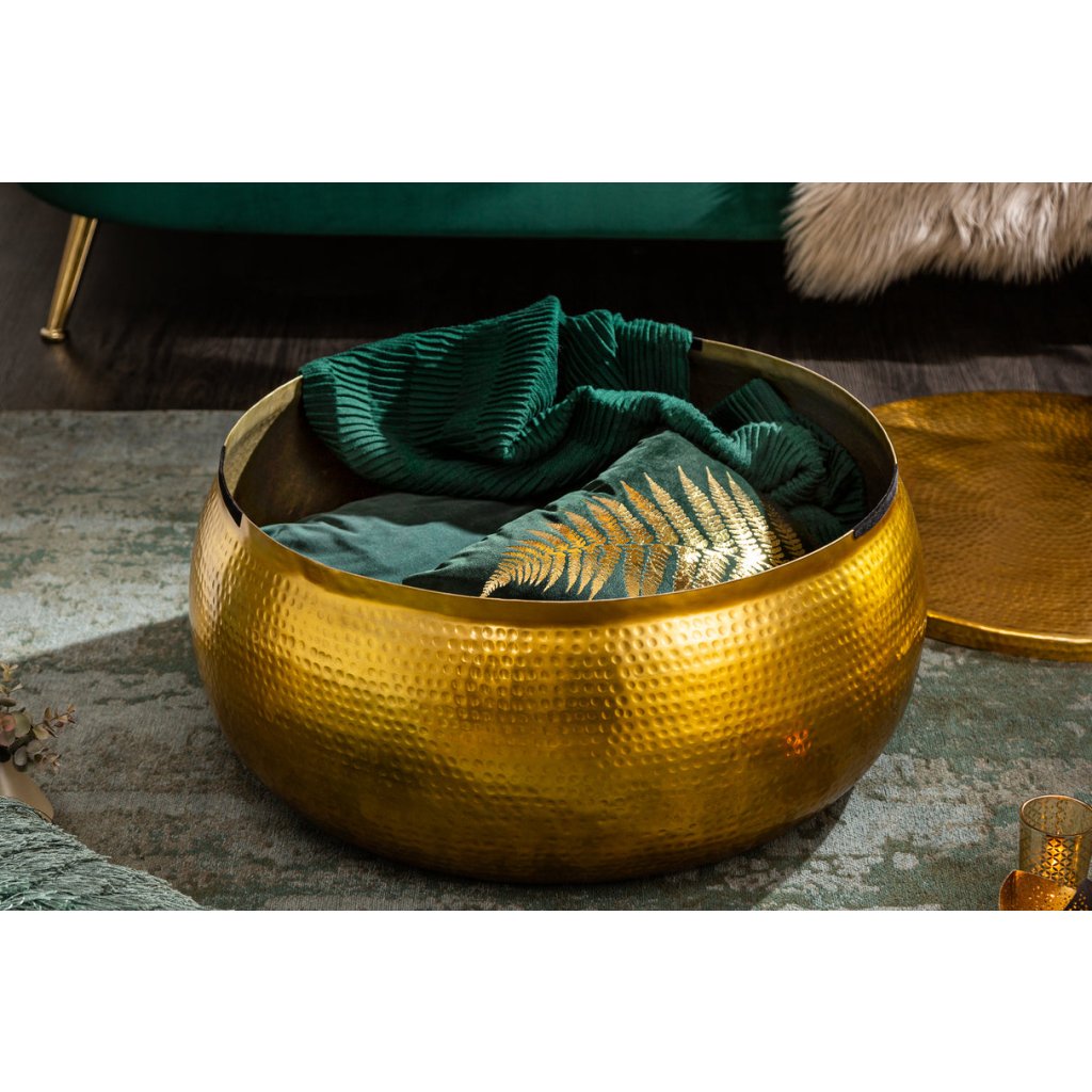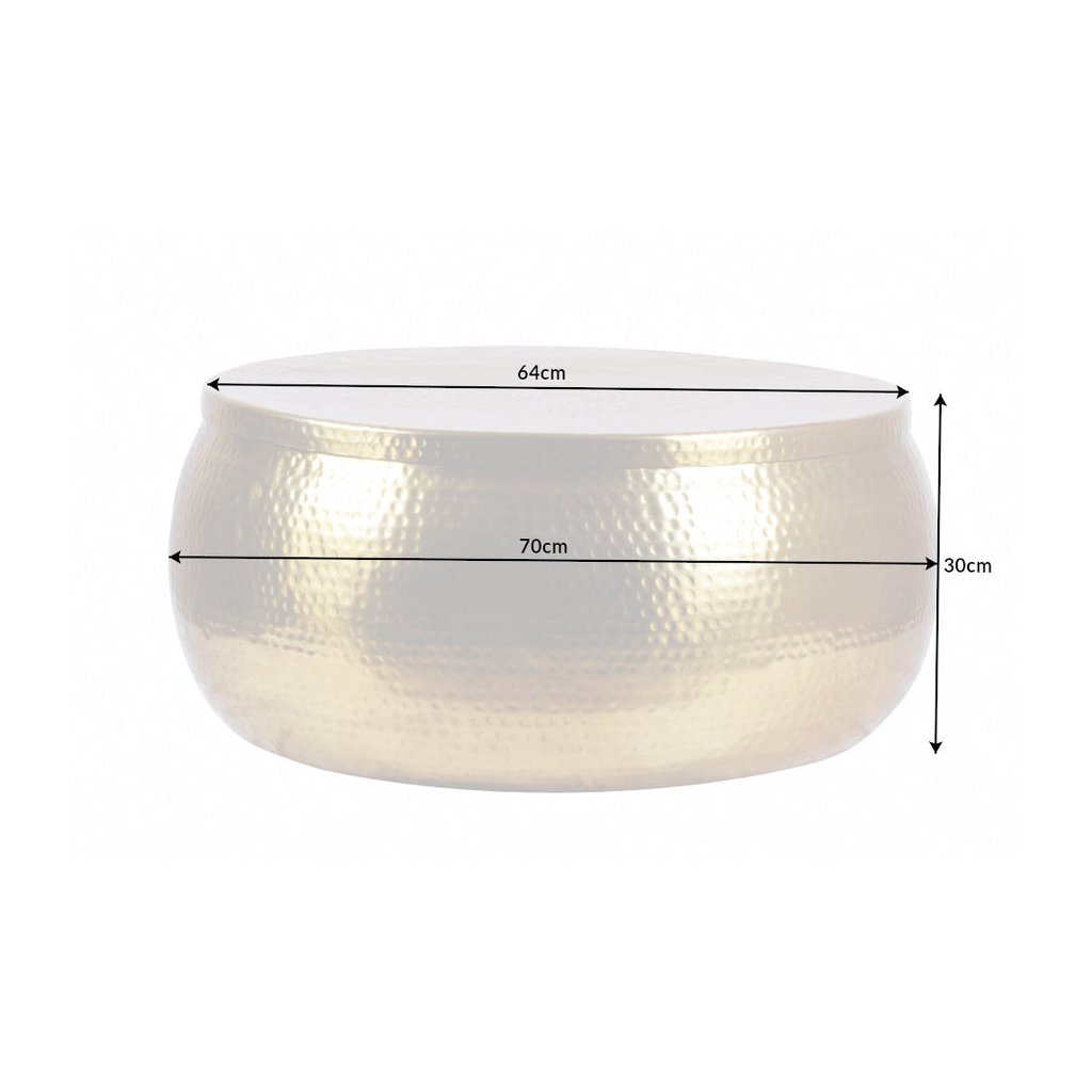 Designový konferenční stolek ORIENT od německé značky designového nábytku INVICTA. Stolek je opravdu nádherný výrobek, který je ručně vyroben z hliníkového plechu v blyštivě zlatém provedení a jednotlivými díry po údery kladivem. Díky průměru 70 cm poskytujete dostatek prostoru na kávu, TV ovladač a další potřebnosti. Hliník je velmi lehký a tak nebude těžké se stolkem manipulovat. K dostání v jiných barvách a velikostech.
