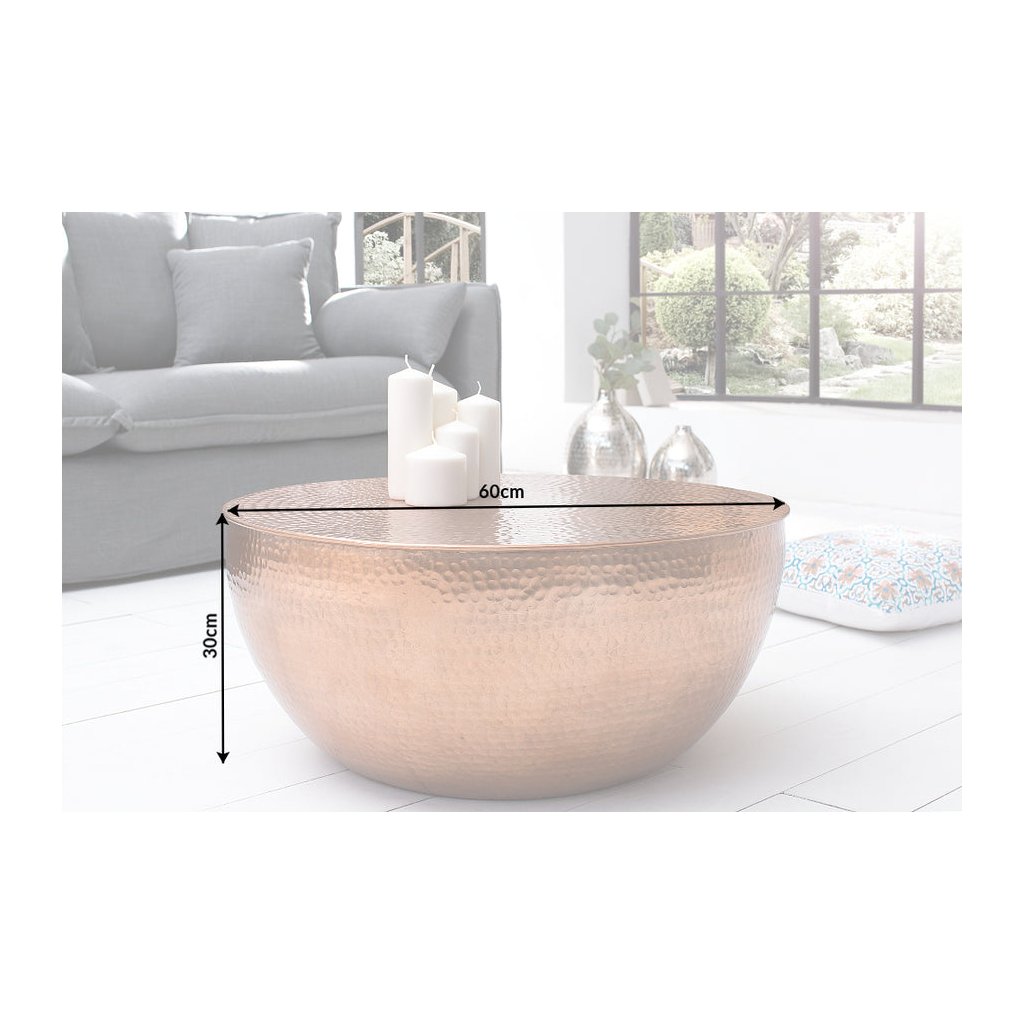 Designový konferenční stolek ORIENT II od německé značky designového nábytku INVICTA. Stolek je opravdu nádherný výrobek, který je ručně vyroben z hliníkového plechu v měděném provedení a jednotlivými díry po údery kladivem. Díky průměru 60 cm poskytujete dostatek prostoru na kávu, TV ovladač a další potřebnosti. Hliník je velmi lehký a tak nebude těžké se stolkem manipulovat.