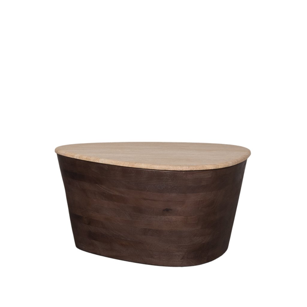 Designový konferenční stolek RAVI od holandského výrobce nádherného nábytku LABEL 51. RAVI má základnu kompletně vyrobenou z mangového dřeva v hnědé barvě. Stůl je zakončen deskou z travertinu, přírodního kamene. Travertin má světlou barvu, která sahá od krémové po béžovou, s jedinečnými žilkami a texturami, což každému stolu dodává autentický a luxusní charakter. Organický trojúhelníkový tvar dodává stolu moderní vzhled. Konferenční stolek je k dispozici v různých velikostech.