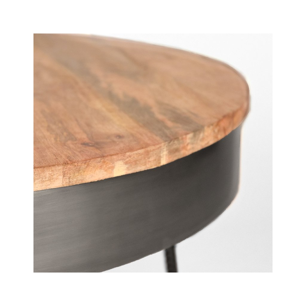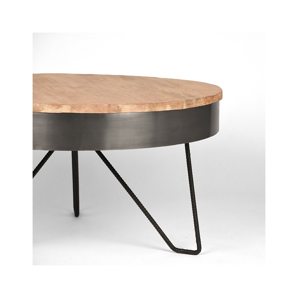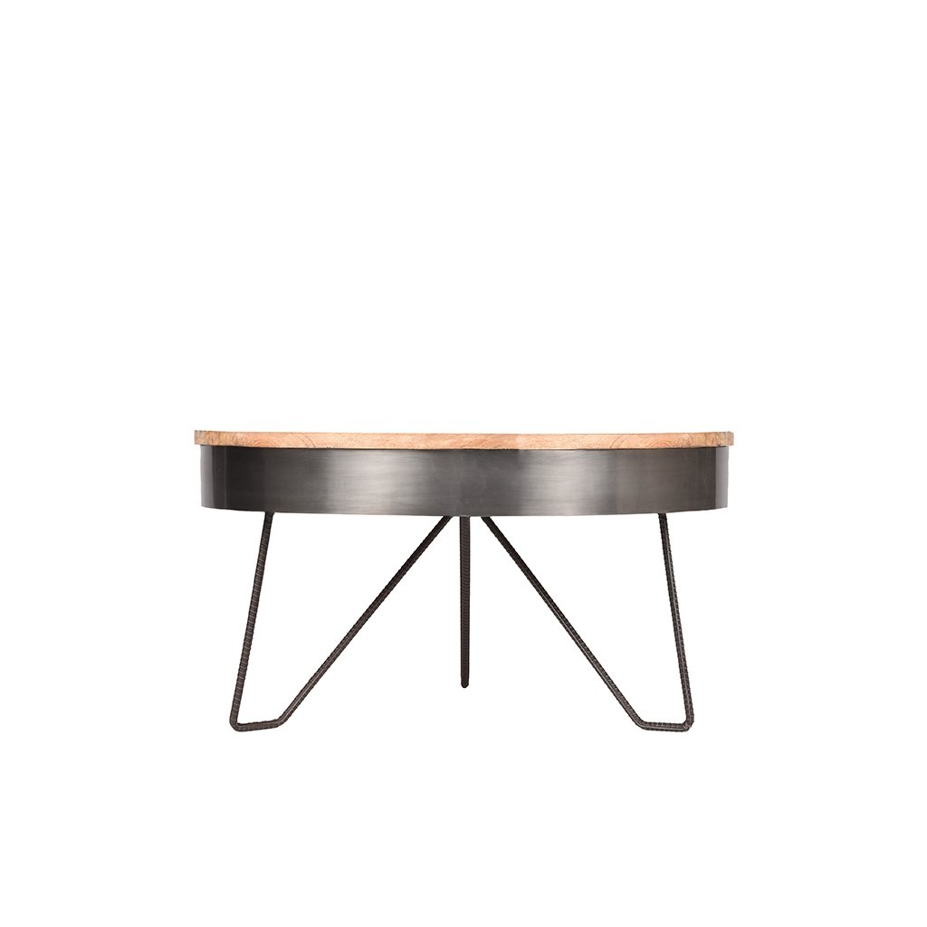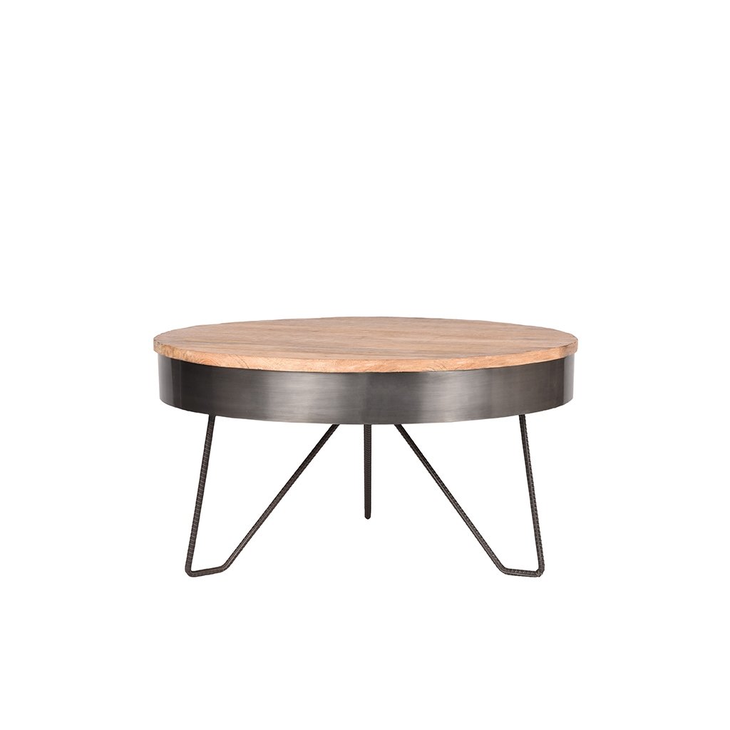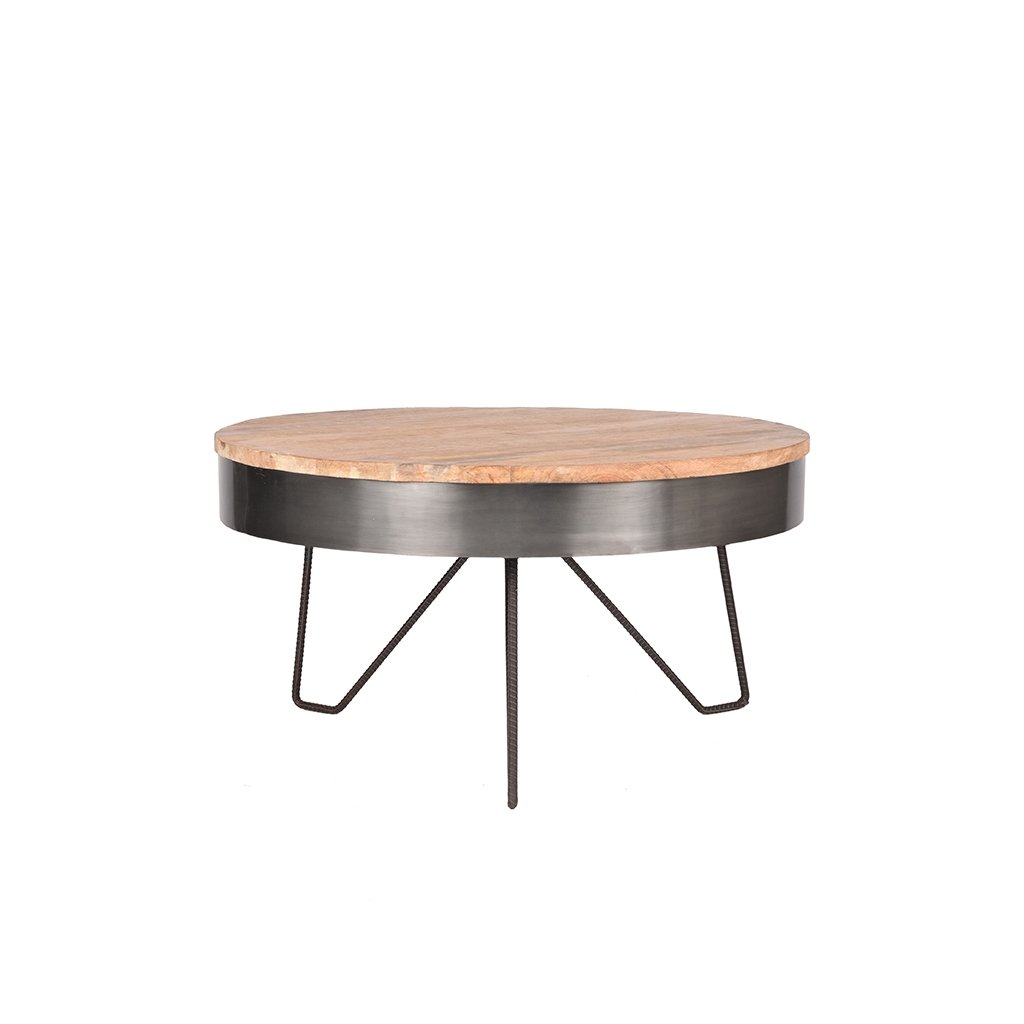 Stylový konferenční stolek SARAN od holandského výrobce industriálního nábytku LABEL51. SARAN tvoří 3 dvojnohy z tenkého stříbrného vroubkovaného kovu, což stolku zajišťuje maximální nosnost, stabilitu a pevnost. Na nohy navazuje vrchní kulatý rám stolku ze stříbrného kovu, na němž sedí kulatá deska s průměrem 80cm z masivního mangového dřeva. SARAN je šikovný, ručně vyrobený stůl z těch nejkrásnějších materiálů. SARAN je díky své hravé a otevřené konstrukci středobodem vaší domácnosti.