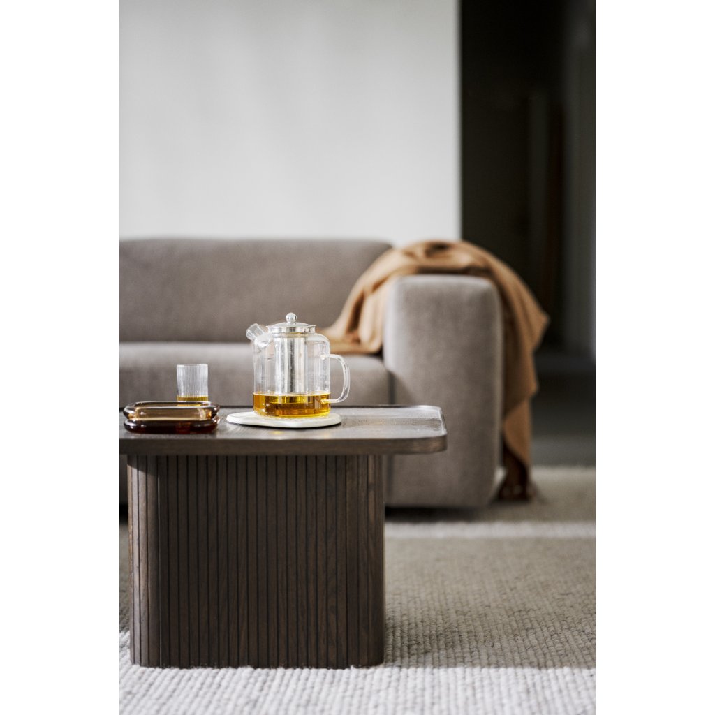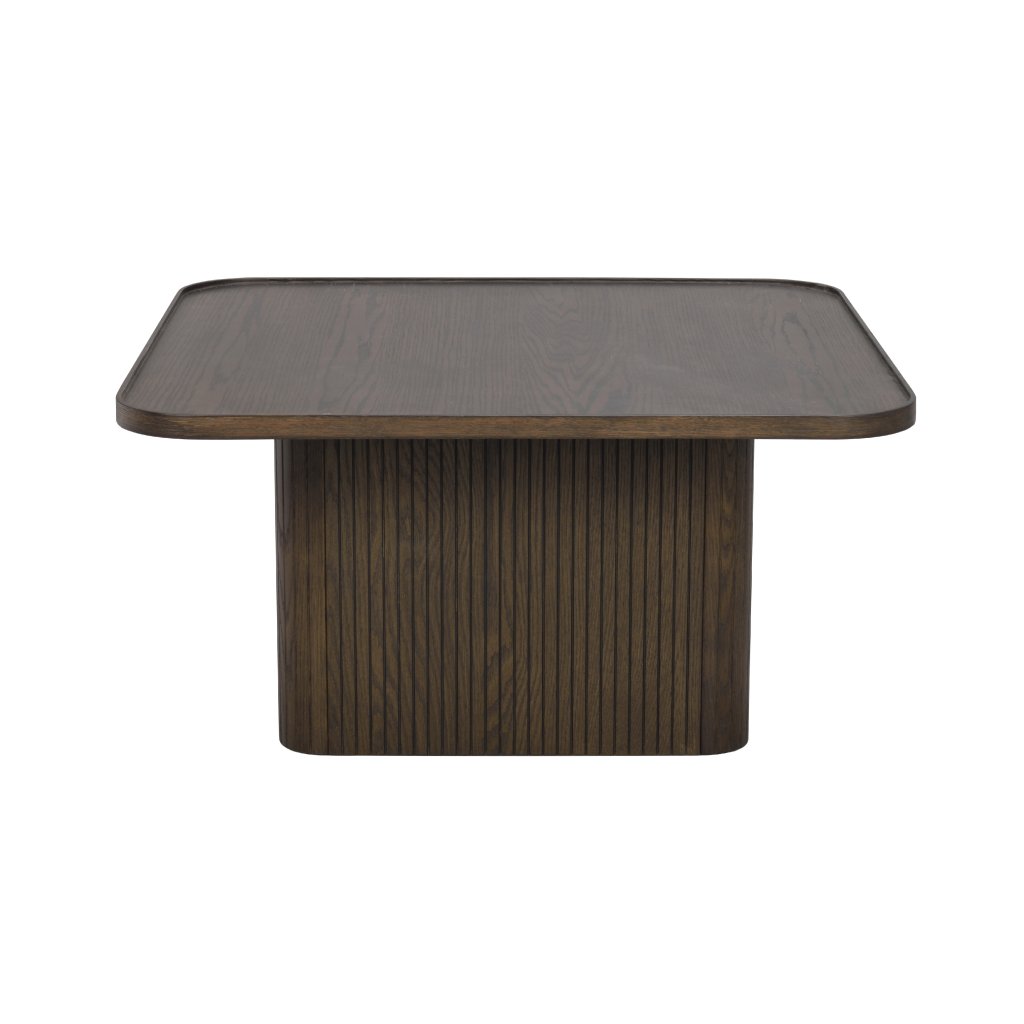 Konferenční stolek SULLIVAN od švédského výrobce kvalitního dřevěného nábytku ROWICO. Tvoří ho vrchní čtvercová deska se zaoblenými hranami a vrchním zvýšeným okrajem proti svévolnému padání předmětů na zem. Deska je vyrobena z krásné tmavé dubové dýhy. Noha stolku má stylové linie. Má taktéž pravidelný tvar a je vyrobena ze stejné dubové dýhy. Nádherný detail tvoří jemné drážky v dýze, což vytváří vskutku unikátní stolek.