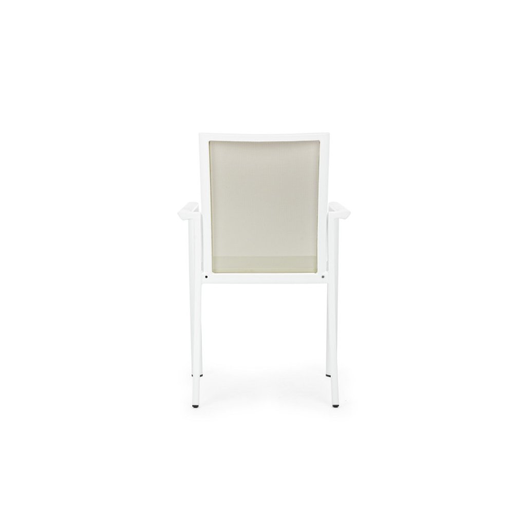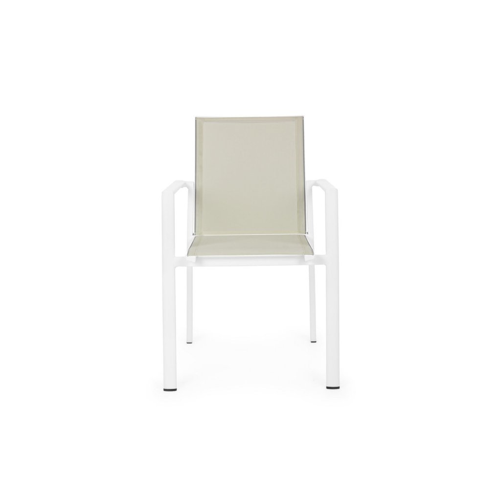 Designová venkovní židle s opěrkami KONNOR od italské firmy stylového nábytku BIZZOTTO. KONNOR tvoří pevný bílý rám z hliníku, židle je díky tomu velmi lehká. Šedý sedák a opěradlo je z umělé textilie v krémové barvě. Můžete stohovat 2 židle. Krásná a jednoduchá židle!