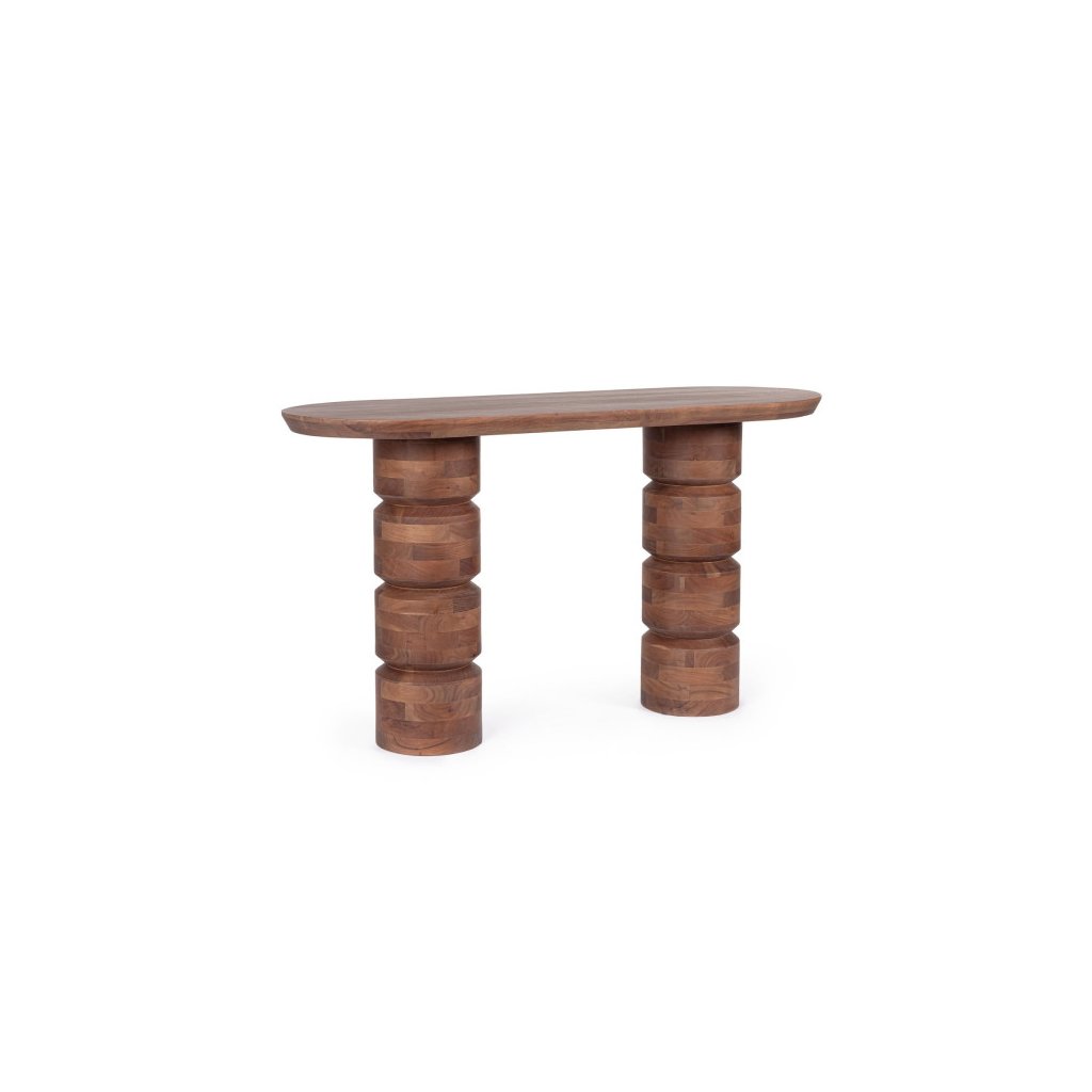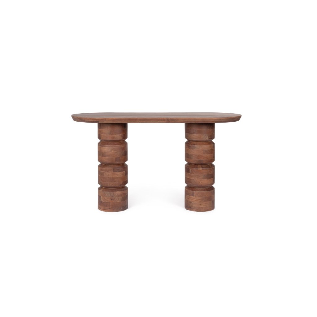 Designový dřevěný konzolový stolek CORTEZ od italského výrobce kvalitního nábytku BIZZOTTO. Konzolový stolek CORTEZ v hnědém odstínu je stylový a funkční kus nábytku vyrobený z masivního mangového dřeva. Povrchová úprava na bázi nitrocelulózy zvýrazňuje přirozenou kresbu dřeva a dodává stolku elegantní, teplý charakter. Se svou šířkou 130 cm a hloubkou 45 cm nabízí dostatek odkládacího prostoru, zatímco jeho subtilní nohy zajišťují stabilitu i vzdušný vzhled.