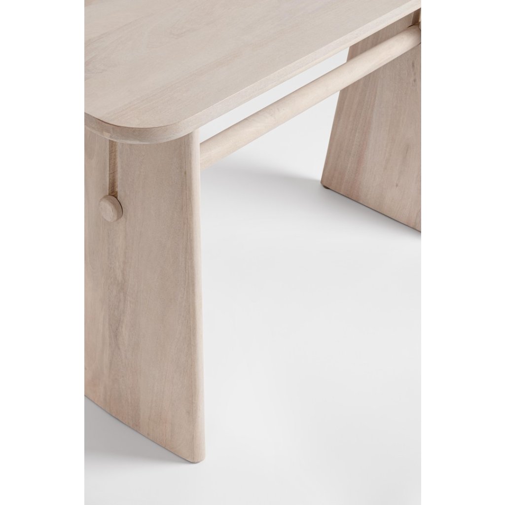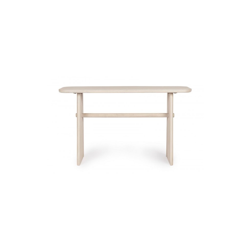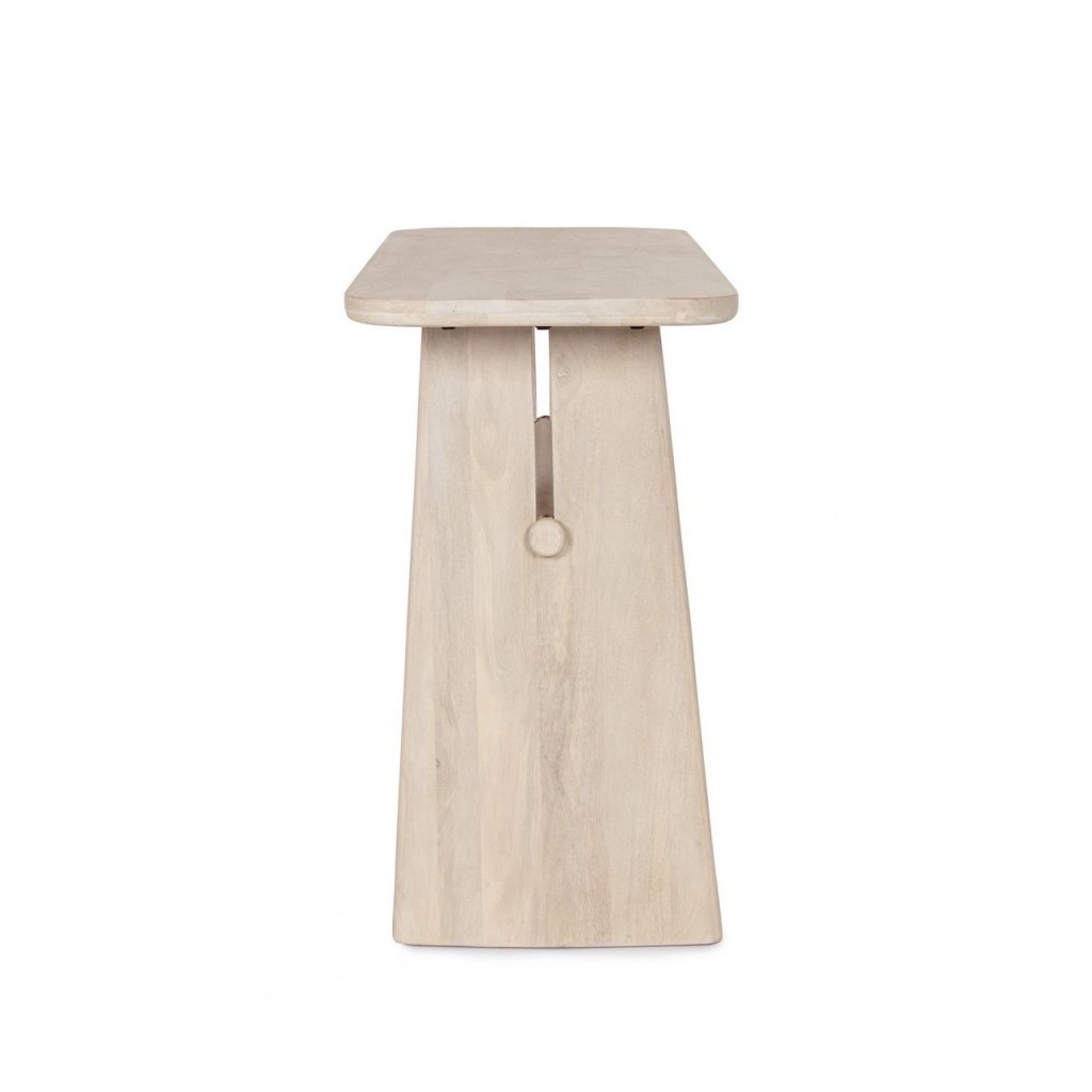 Designový dřevěný konzolový stolek ELISHEVA od italského výrobce kvalitního nábytku BIZZOTTO. Stolek ELISHEVA se skládá ze 2 masivních dřevěných propojených nohou, díky kterým je stolek pevný a stabilní. Tělo stolku tvoří deska z mangového dřeva. Celý stolek je ve světlém provedení s nitrocelulózovým nátěrem.