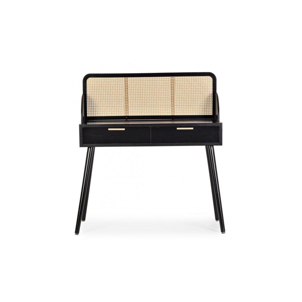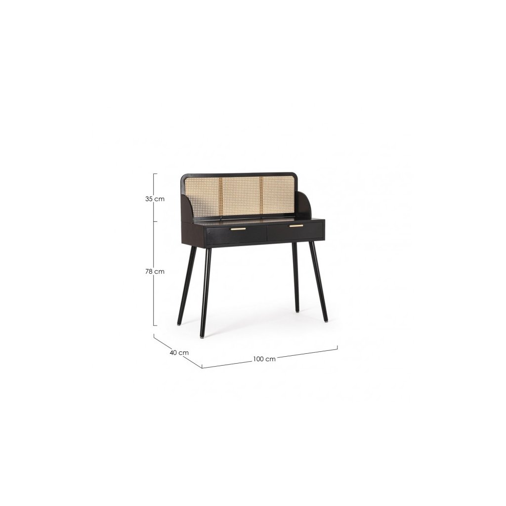 Designový konzolový stolek JOSINE od italského výrobce stylového nábytku BIZZOTTO. JOSINE je stylový konzolový stolek vyroben z černé mdf desky. Je celkem prostorný, k dispozici jsou zde 2 šuplíky otevírající se pomocí kovových úchytů. Maximální nosnost a stabilitu zajišťují 4 nohy z borovicového dřeva. Zajímavým prvkem je vyplnění předních strany šuplíků ratanem ve světlé barvě. Moderní kus nábytku nadchne nejednoho obdivovatele moderního minimalismu.