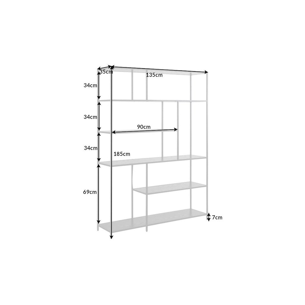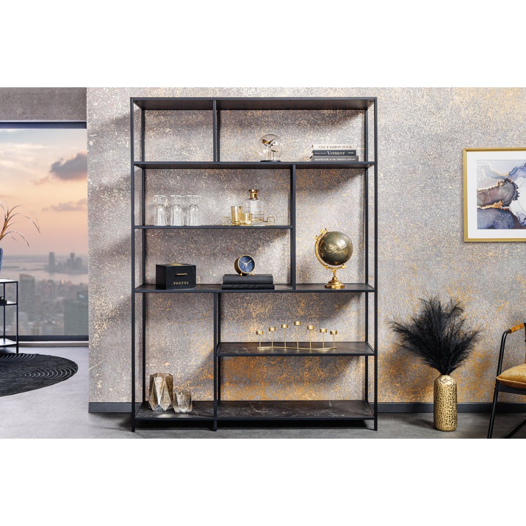 Designová kovová knihovna SLIM LINE od německé značky nádherného nábytku INVICTA. VITA má konstrukci 185x135x35 cm z tenkého kovu v černém laku, na než je položeno několik dlouhých a krátkých polic z tenké černé desky s melaminovou fólií imitující černý mramor, na které můžete směle vyskládat svoje knihy, vázy, květiny či jiné dekorace a zkrášlit tím tak svůj domov. Díky nepravidelnému provedení jde o velmi stylový a designový prvek. K dostání i v menším provedení.