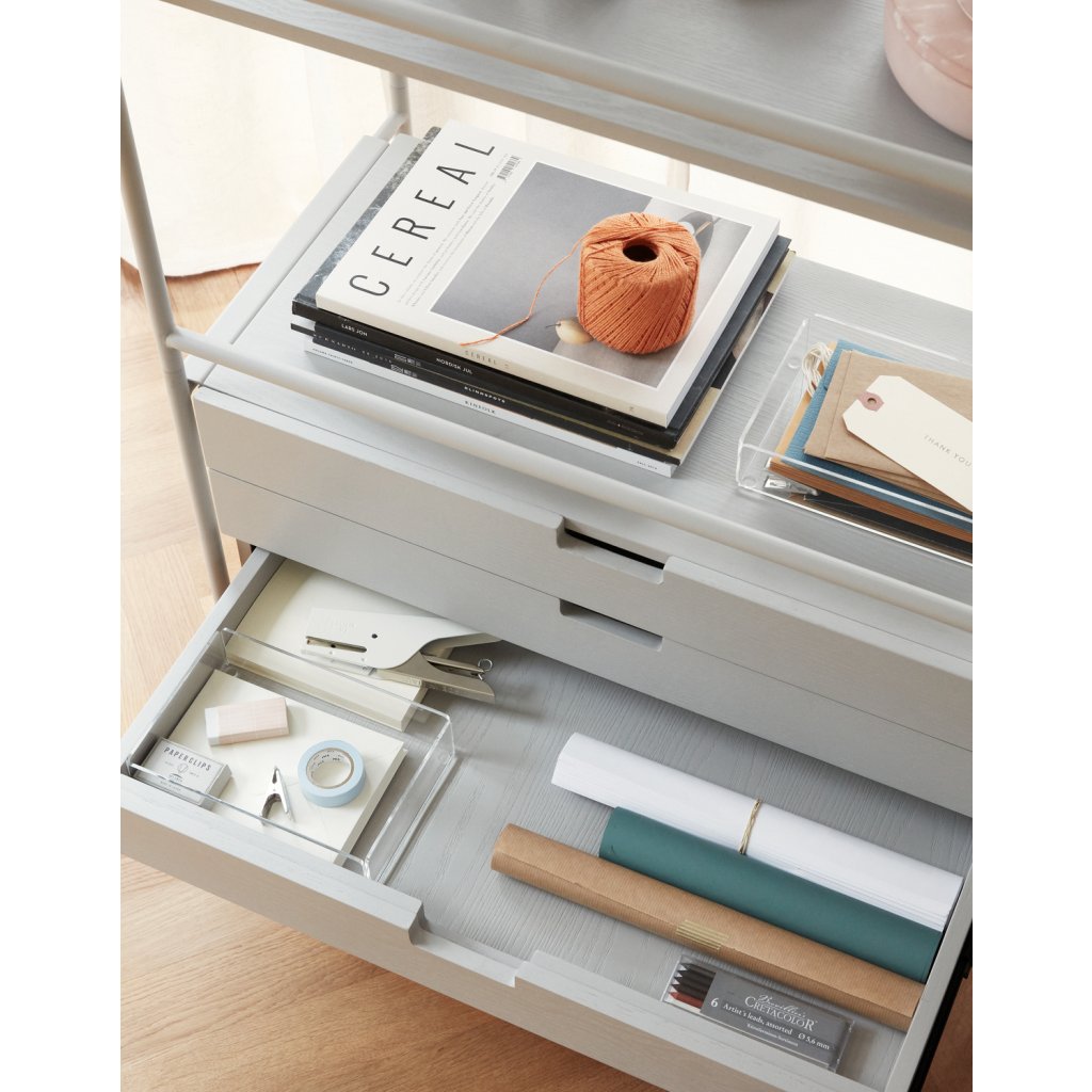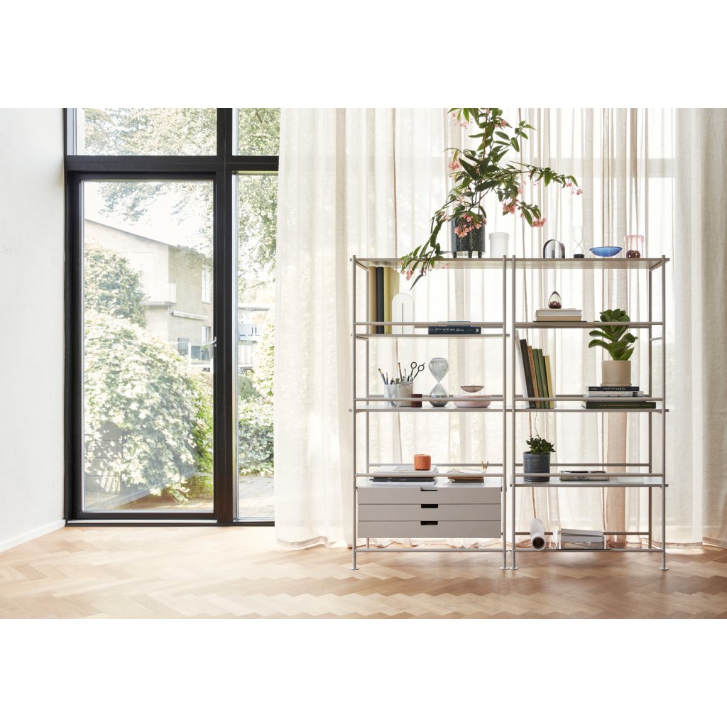 Designový víceúčelový regál KUMO od dánské značky skandinávského nábytku HÜBSCH. Regál je vyroben z kovu ve světle šedé barvě, obsahuje zásuvky a police, které jsou vyrobeny z masivního jasanového dřeva v šedé barvě a drobné police ze skla. Je rozdělen na 2 části, levá se zásuvkami na knihy či jiné věci, pravá na otevřené police. Uložíte a vystavíte velkou část svých věcí kdekoliv doma.
