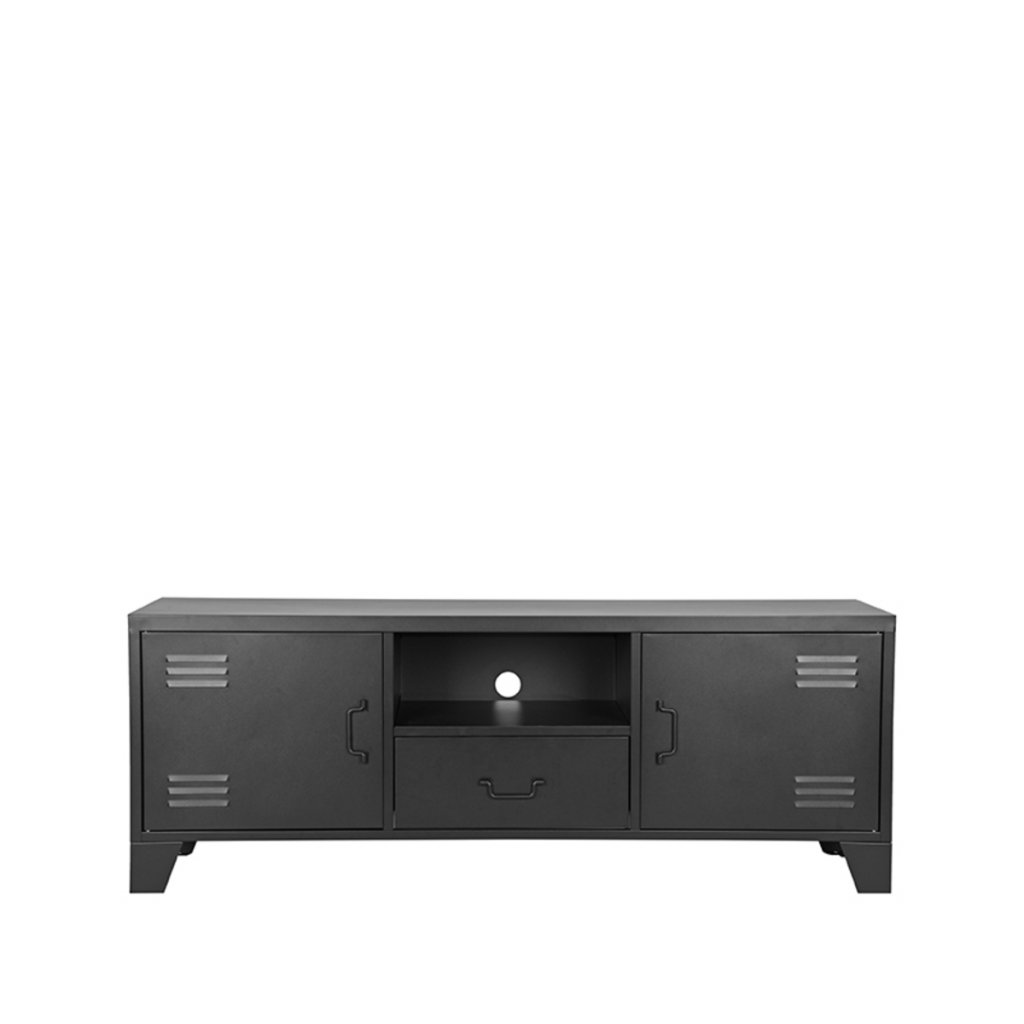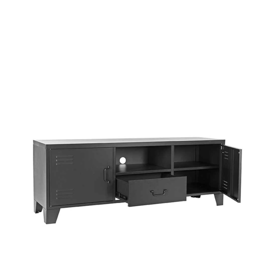 Stylový kovový tv stolek FENCE od holandského výrobce industriálního nábytku LABEL51 v provedení černého kovového plechu, který připomíná a navazuje na šatní skříňky z velkých pracovišť a továren. Má celkem 6 oddělených polic, z nichž 4 jsou zavřeny za 2 dvířky, 1 police uprostřed je kompletně otevřená a poslední police pod ní pak slouží jako zásuvka. Zásuvka a dvířka mají kovové úchytky, takže se dobře otevírají a nechybí ani kulatý otvor na protažení kabelů od vašich spotřebičů na televizi.