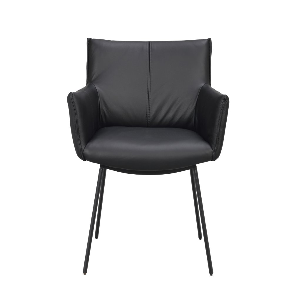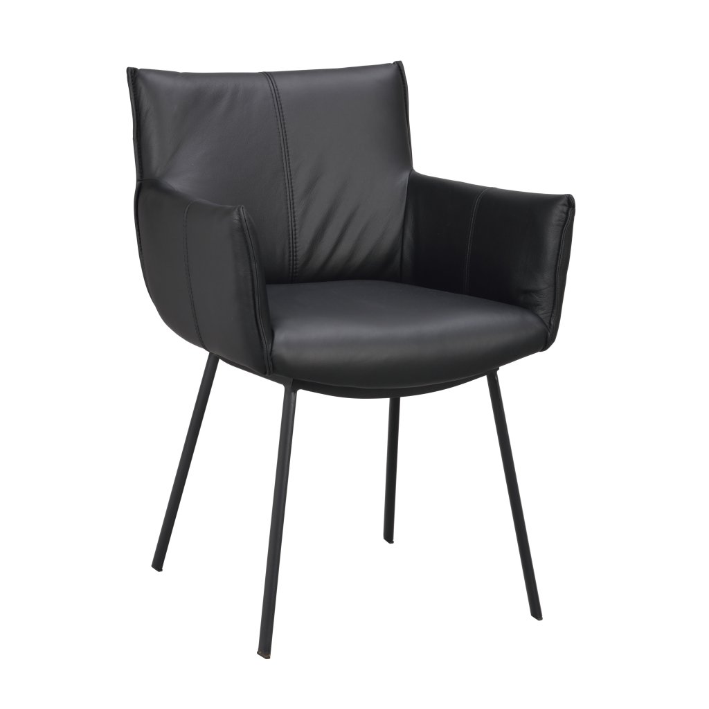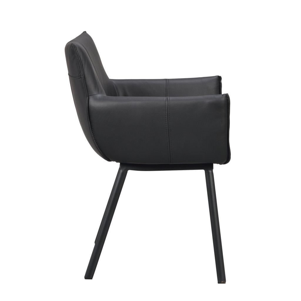 Designová kožená jídelní židle s područkami HINCKLEY od švédského designového výrobce kvalitního dřevěného nábytku ROWICO. Židle je vyrobena z černé kůže s kovovými nohami s černým práškovým nástřikem. Díky své vysoké kvalitě, pohodlnému sezení a detailům s prošíváním okrajů ji lze používat po celé generace. Lze ji využít jako jídelní židli ke stolu nebo také jako křeslo vedle pohovky.