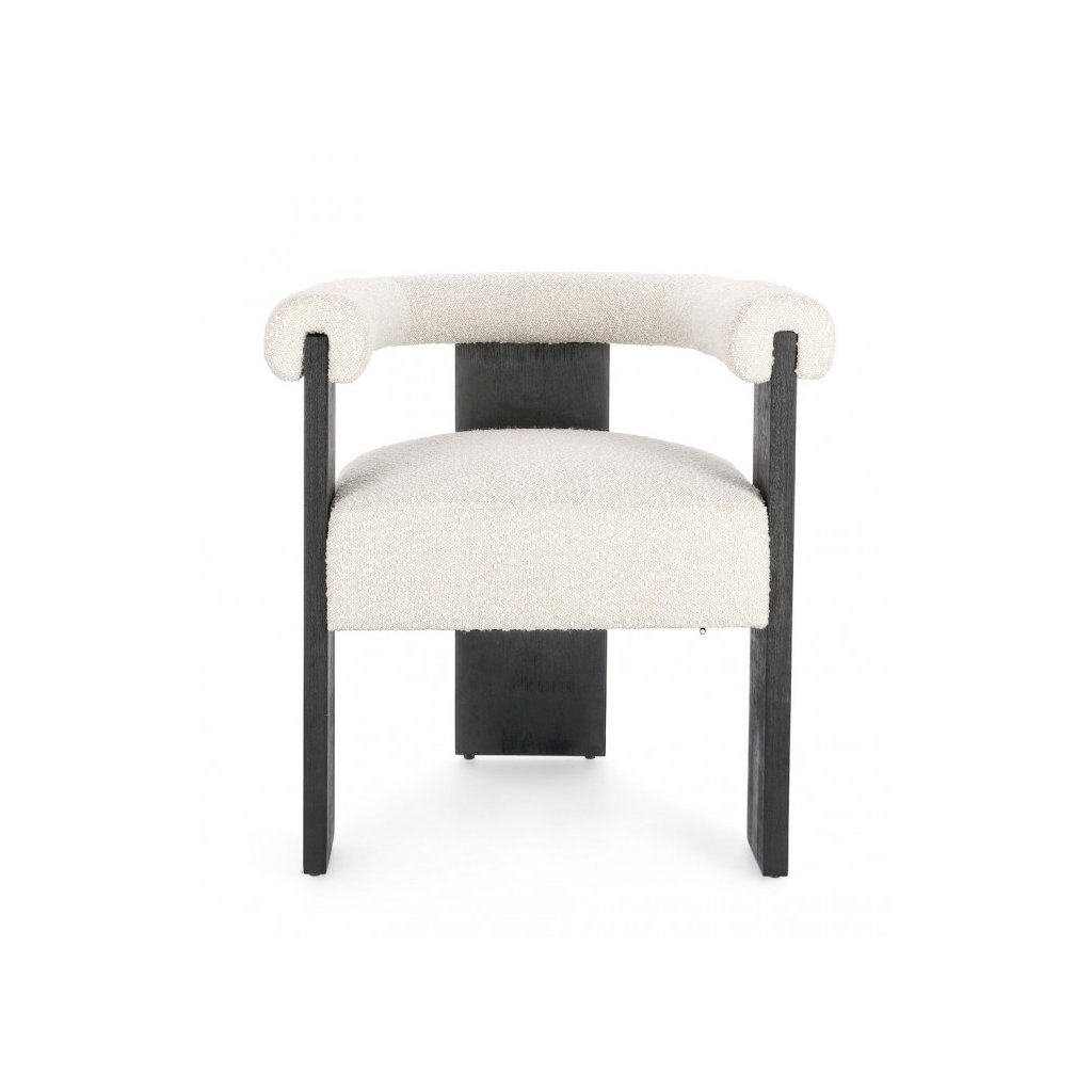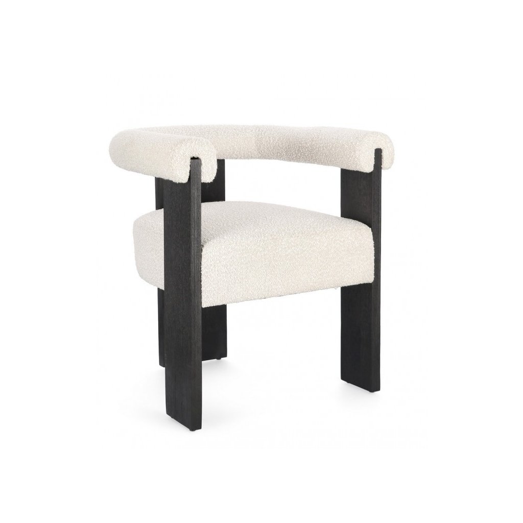 Designové jídelní křeslo AGAPE od italského výrobce kvalitního nábytku BIZZOTTO. Křeslo AGAPE má opravdu jedinečný a netradiční vzhled s lehkým nádechem retra. Pevnou stabilitu udržují nohy ze dřeva kaučukovníku. Hlavním znakem tohoto křesla je viditelná konstrukce 3 nohou, které jsou spojeny do zadní opěrky. Vše kompletně čalouněné v bílém vlnitém potahu bouclé.  Do tohoto křesla se určitě ihned zamilujete.
