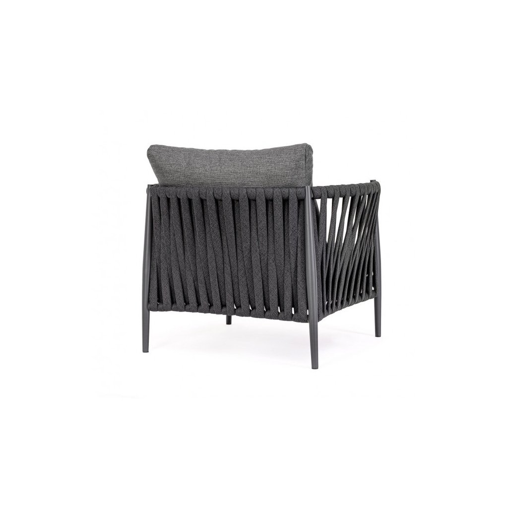 Designové  zahradní křeslo JACINTA od italského výrobce nádherného nábytku BIZZOTTO. JACINTA je dodáváno s rámem ze 4 kovových nohou, které jsou navzájem propojeny. To dodává tomuto křeslu maximální stabilitu a pevnost. Vrchní část křesla tvoří sedák s opěrkou a područkami, které jsou obvázány polyesterovými lany v černé barvě a dodávají tak křeslu originální design. Sedák a polštářek jsou potaženy polypropylenovou látkou, která je pohodlná a příjemná na dotyk. Díky odolnému materiálu je možné využít jak uvnitř, tak i venku.