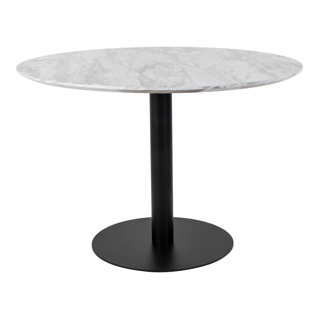 Designový kulatý jídelní stůl BOLZANO od dánské značky nádherného skandinávského nábytku HOUSE NORDIC. Stůl tvoří krásná vrchní kulatá deska s průměrem 110cm z mdf dřevovláknité desky s vrchní fólií v dekoru bílého mramoru s typickým šedým žíháním. Stolek je usazen na 1 kulaté noze z černě lakovaného kovu. To vše vytváří luxusně vypadající krásný jídelní stolek s kompaktními rozměry.