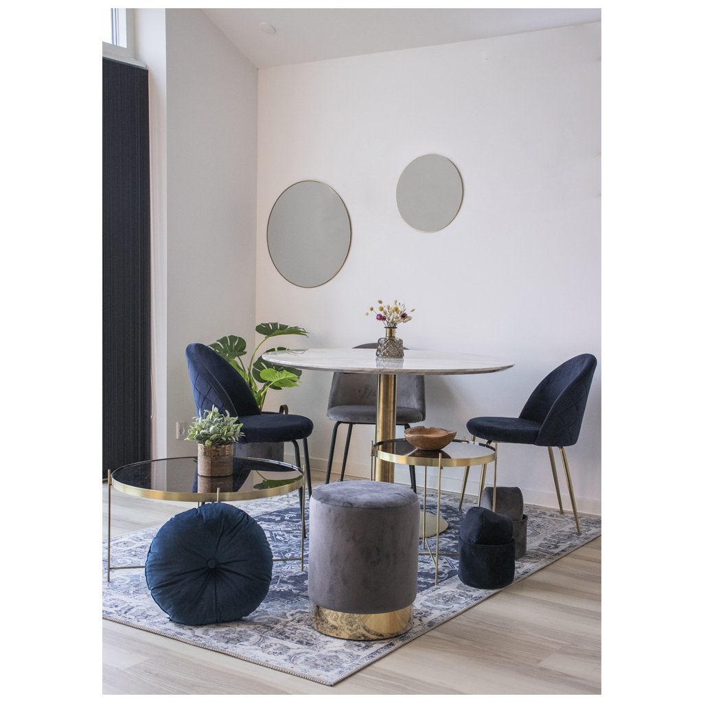Designový kulatý jídelní stůl BOLZANO od dánské značky nádherného skandinávského nábytku HOUSE NORDIC. Stůl tvoří krásná vrchní kulatá deska s průměrem 110cm z mdf dřevovláknité desky s vrchní fólií v dekoru bílého mramoru s typickým šedým žíháním. Stolek je usazen na 1 kulaté noze z kovu v provedení zlata. To vše vytváří luxusně vypadající krásný jídelní stolek s kompaktními rozměry. K dostání i v kombinaci s větší deskou nebo černou centrální nohou.