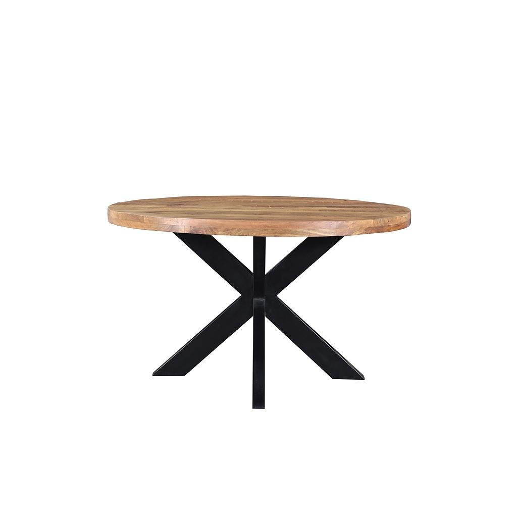 Kulatý jídelní stůl ZIGGY od holandské značky industriálního nábytku LABEL51. Stůl se skládá z 8 navzájem zkřížených robustních nohou z černého kovu, což stolu dodává opravdu industriální vzhled a maximální nosnost a stabilitu. Vrchní část stolu tvoří kulatá deska s průměrem 140cm z masivního a hrubého mangového dřeva ve hnědém provedení. Deska stolu je z masivního mangového dřeva s přírodními nedokonalostmi, takže není 100% hladká a rovná.