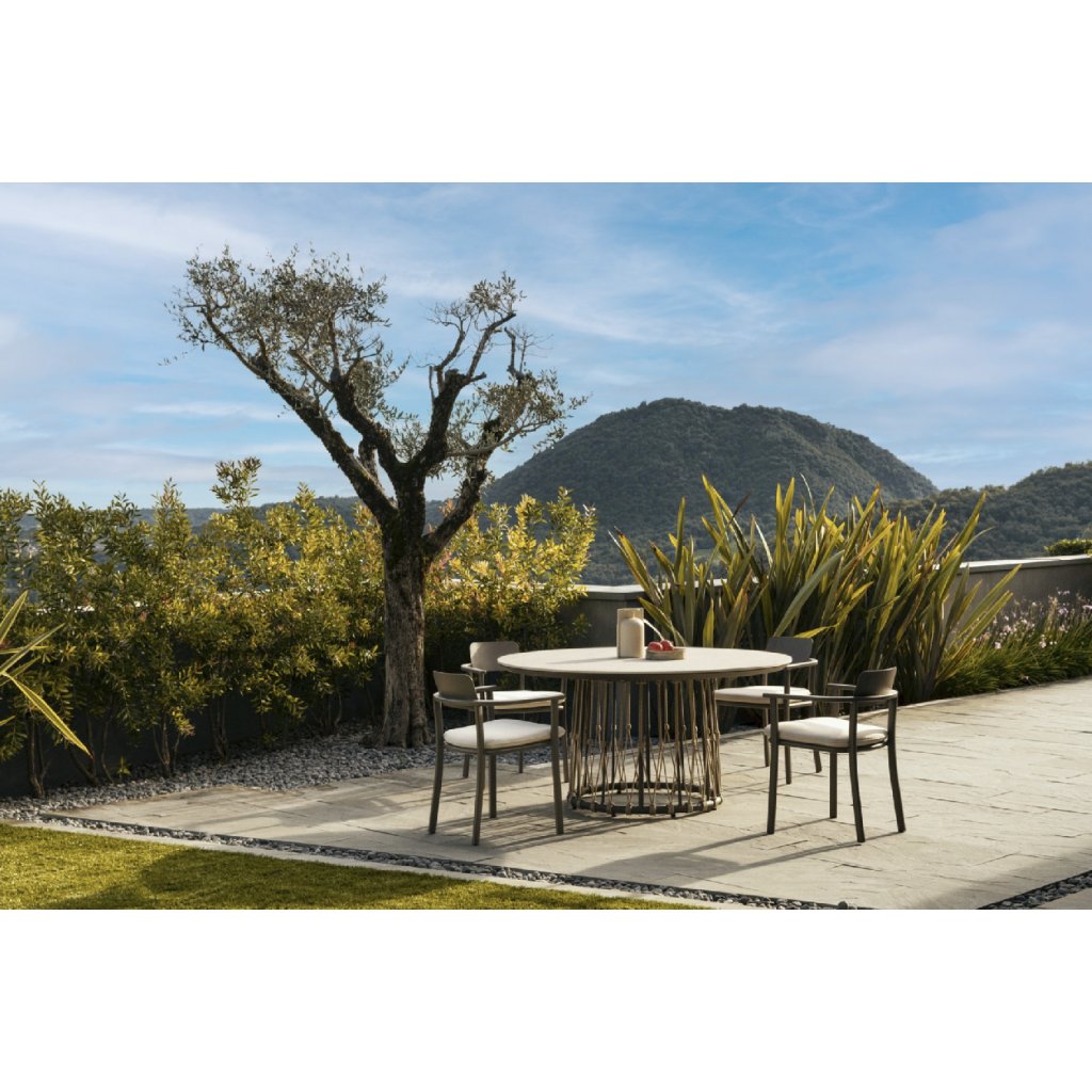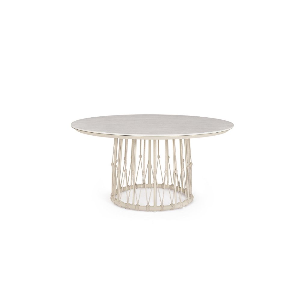 Nádherný kovový zahradní stůl LANAI od italského výrobce stylového nábytku BIZZOTTO. Krásný a unikátní zahradní stůl tvoří vrchní deska 150cm, kterou tvoří zejména 12cm tlustá robustní deska z kamene tvrzeného při vysokých teplotách a to ve světle šedé barvě. Spodek pak tvoří 1 noha v béžové barvě, která kombinuje lehký hliník a světlejší polypropylenová vlákna. V dostání i ve světlejší variantě.