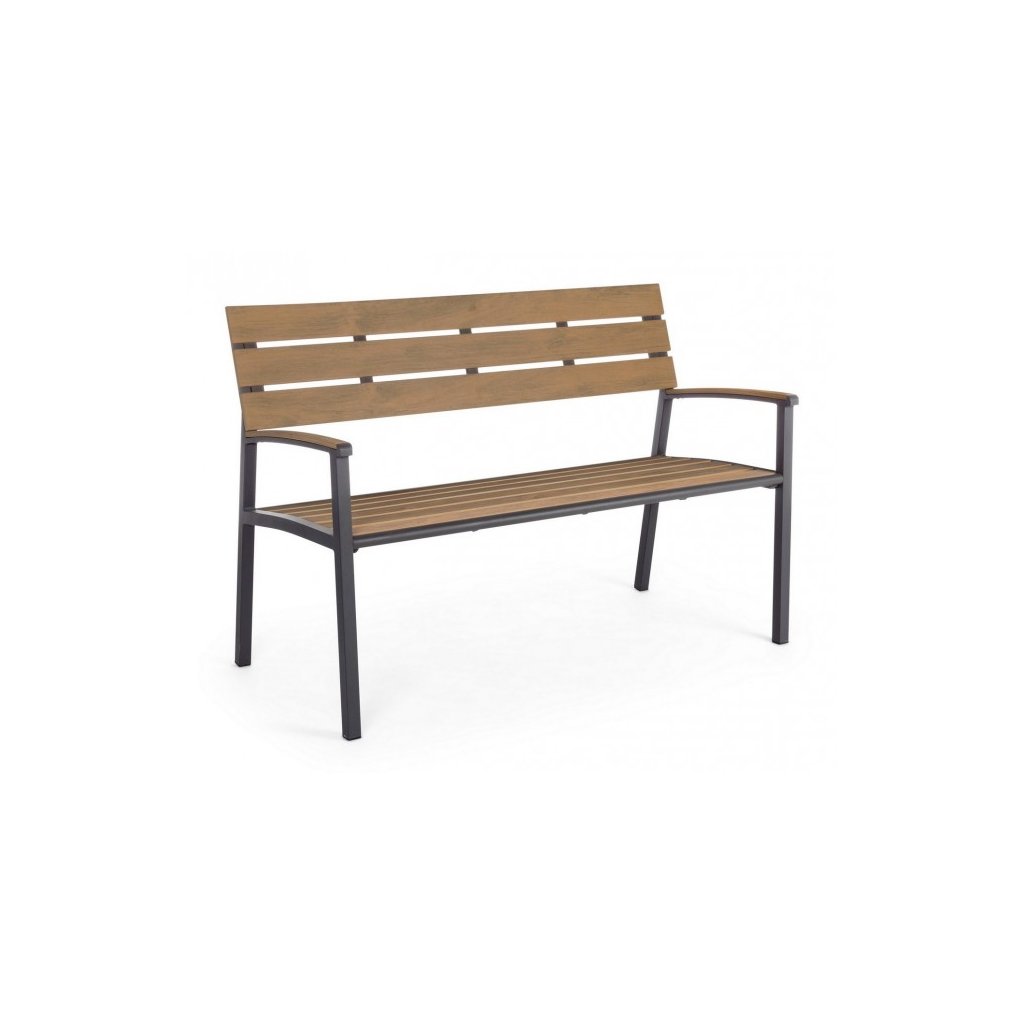 Stylová zahradní lavička ISAK od italského výrobce stylového nábytku BIZZOTTO. Lavice má 4 decentní nohy z černě lakovaného hliníku, které zajišťují maximální stabilitu, nosnost a odolnost křesla. Sedák a opěrka jsou dodávány z jednotlivých prkýnek hnědě barveného umělého dřeva polywood. Díky tomu je lavice lehká a velmi nenáročná na údržbu. V dostání i v bílé variantě.
