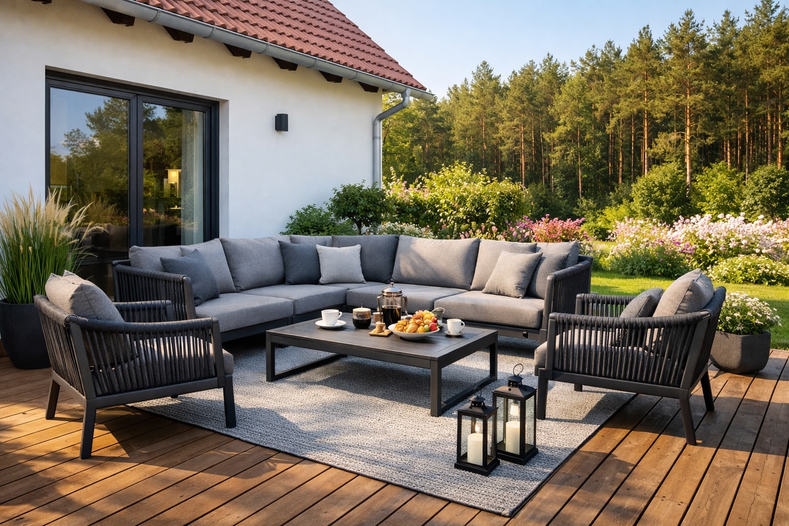 - Textilie a doplňky pro útulnost, například polštáře, plédy a venkovní koberec.