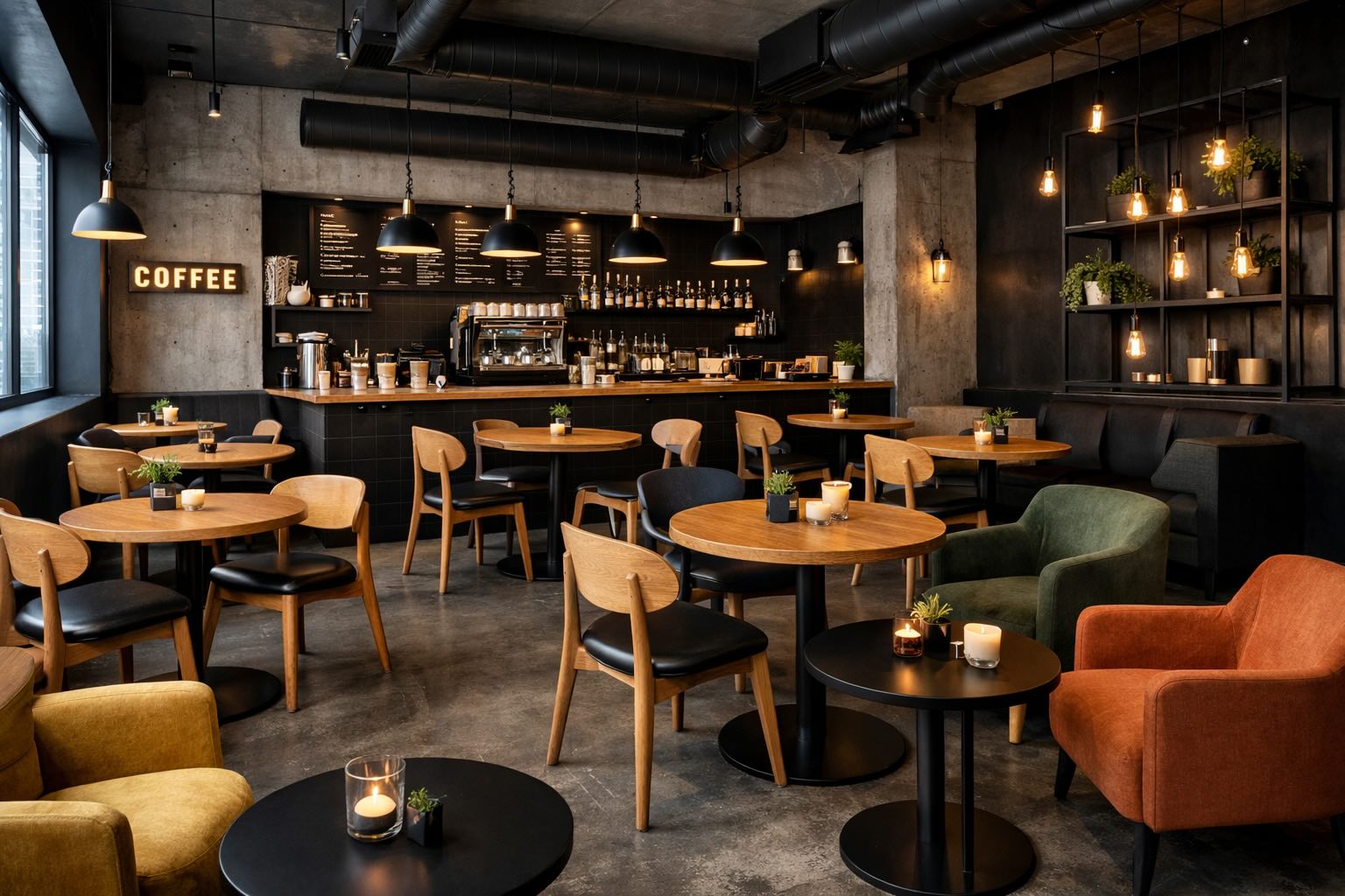 Obrázek 1. Kavárna zařízena v industriálním stylu s tmavými odstíny.