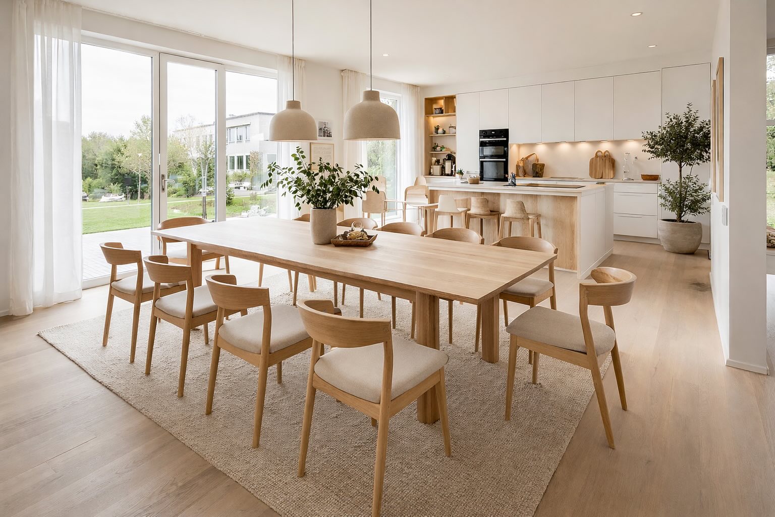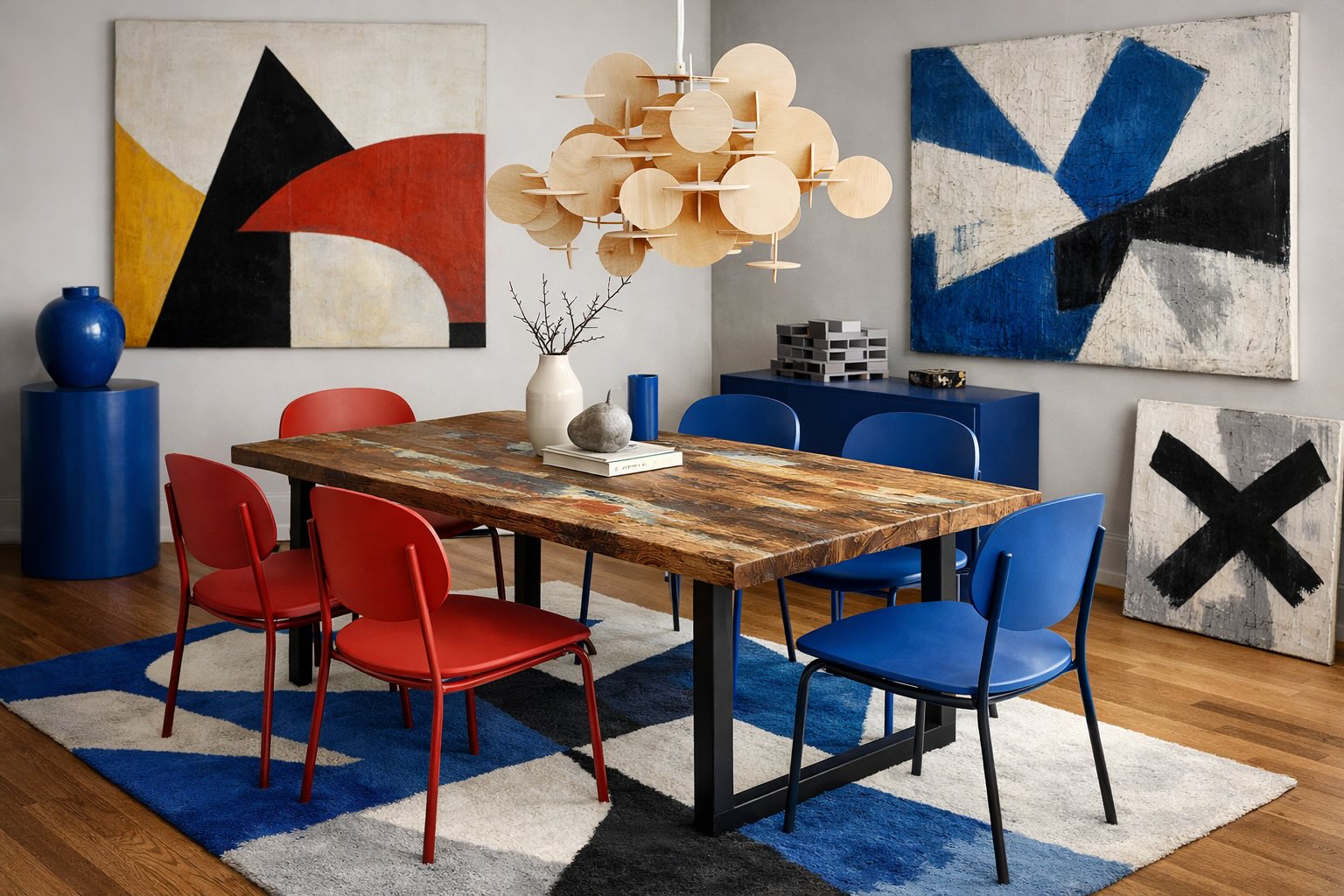 Jídelní stůl a židle tvoří základ, ale celkový dojem dotvářejí i další prvky jako osvětlení, koberec nebo dekorace.