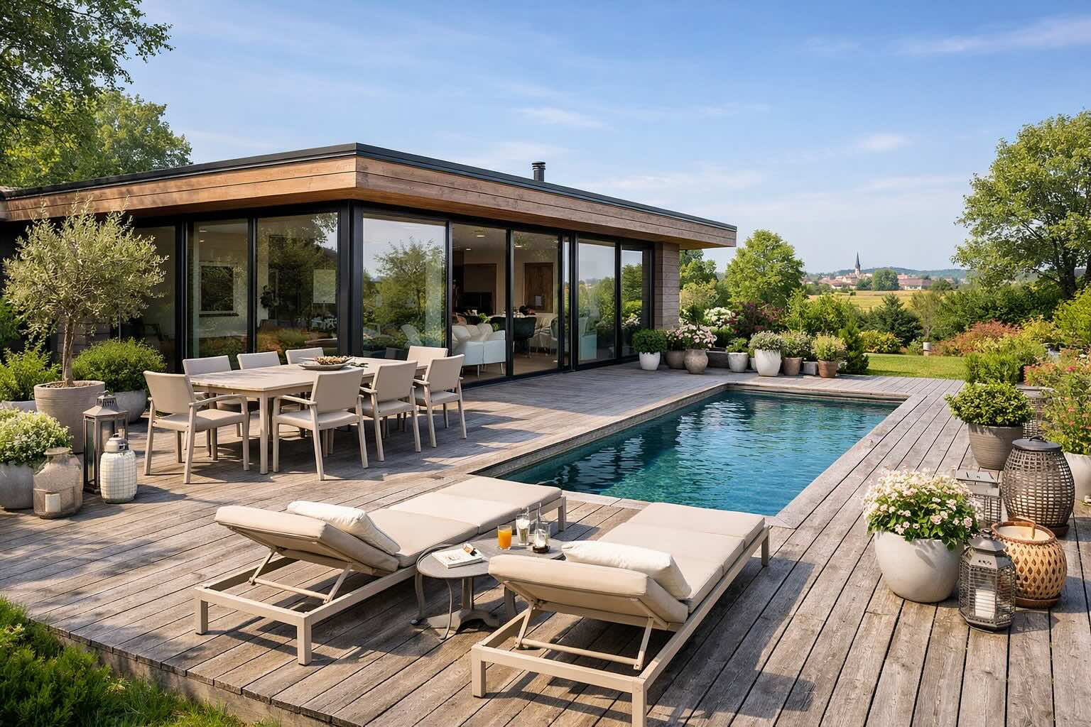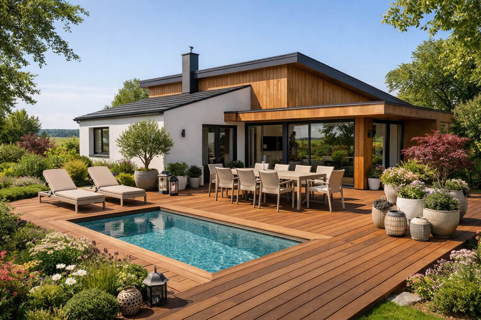 Obrázek 1. Zahradní lehátka u bazénu na zahradě rodinného domu.
